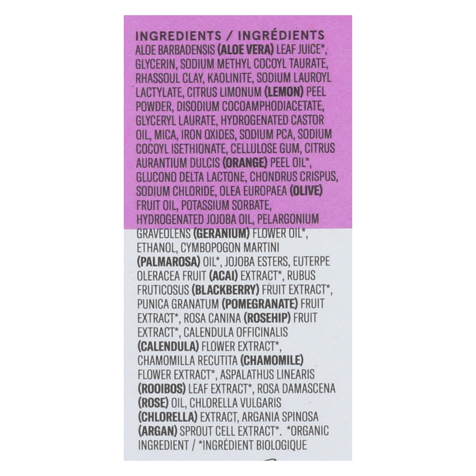 ingredients : aloe barbadensis;aloe vera;leaf juice;glycerin;sodium methyl cocoyl taurate;rhassoul clay;kaolinite;sodium lauroyl lactylate;citrus limonum;lemon;peel powder;disodium cocoamphodiacetate;glyceryl laurate;hydrogenated castor oil;mica;iron oxides;sodium pca;sodium cocoyl isethionate;cellulose gum;citrus aurantium dulcis;orange;peel oil;glucono delta lactone;chondrus crispus;sodium chloride;olea europaea;olive;fruit oil;potassium sorbate;hydrogenated jojoba oil;pelargonium graveolens;geranium;flower