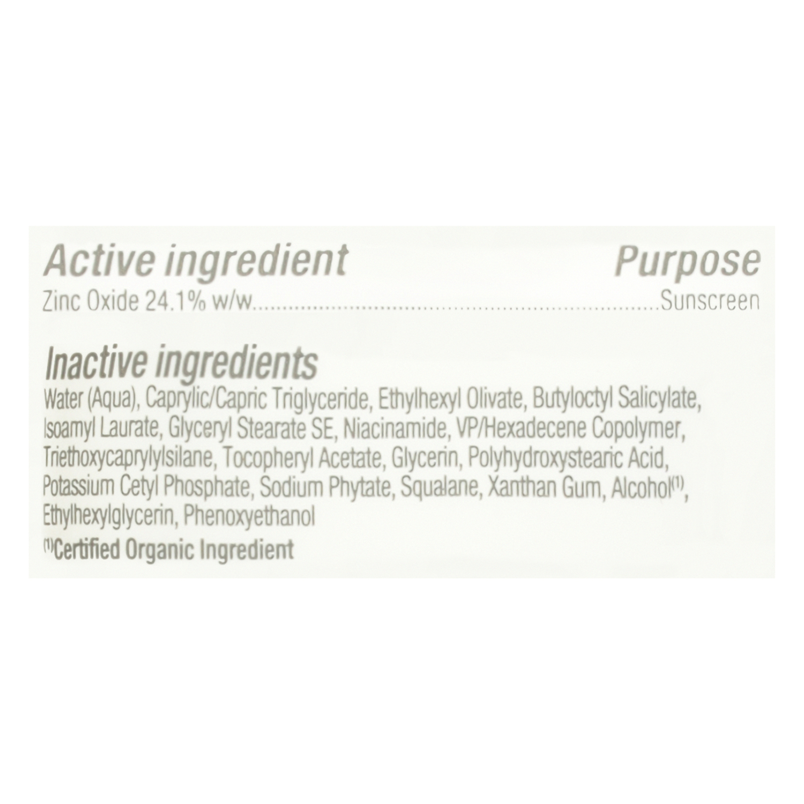 ingredients : zinc oxide 24;1% w/w purpose sunscreen;water (aqua);caprylic/capric triglyceride;ethylhexyl olivate;butyloctyl salicylate;isoamyl laurate;glyceryl stearate se;niacinamide;vp/hexadecene copolymer;triethoxycaprylylsilane;tocopheryl acetate;glycerin;polyhydroxystearic acid;potassium cetyl phosphate;sodium phytate;squalane;xanthan gum;alcohol ;ethylhexylglycerin;phenoxyethanol
