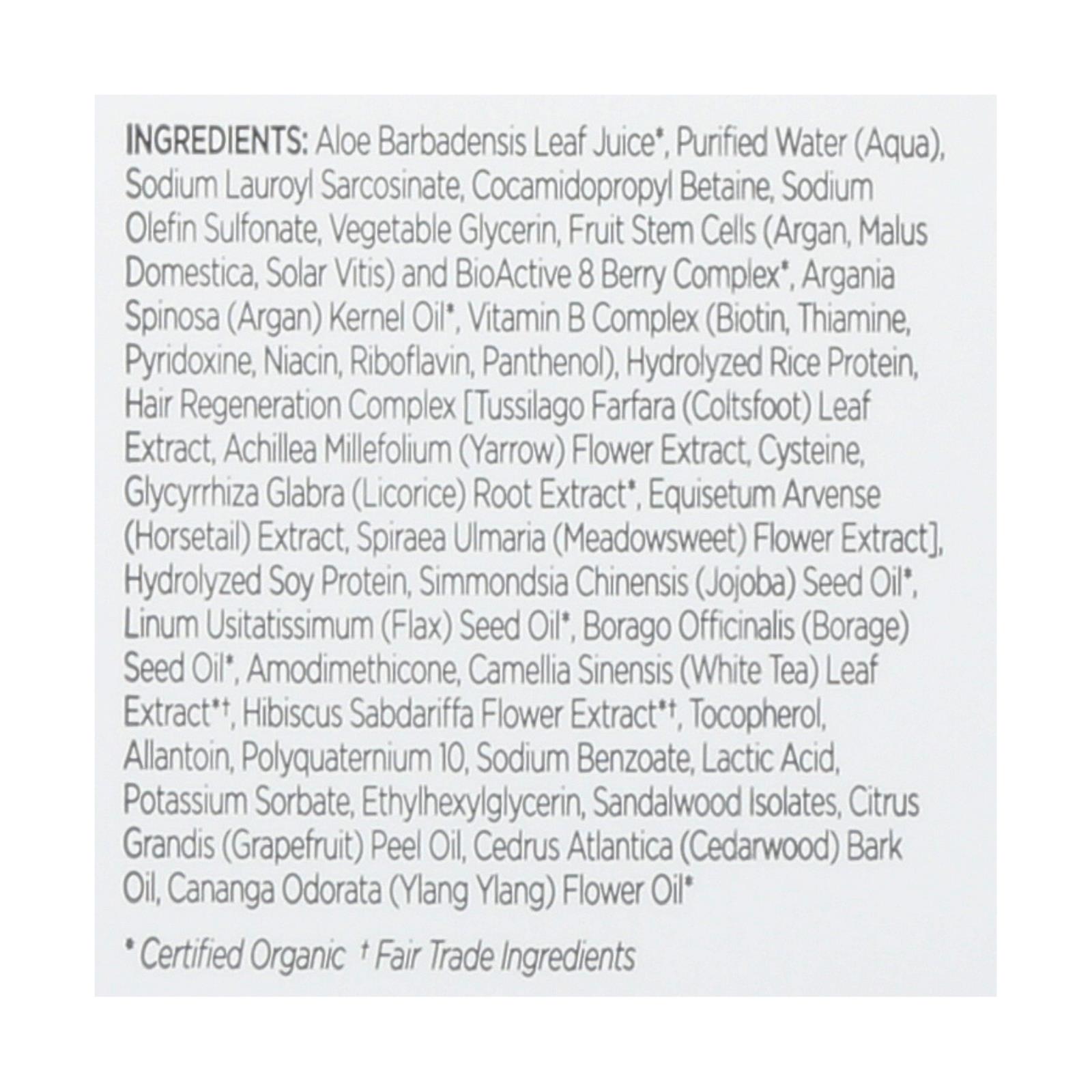 ingredients : aloe barbadensis leaf juice;purified water;aqua;sodium lauroyl sarcosinate;cocamidopropyl betaine sodium olefin sulfonate;vegetable glycerin;fruit stem cells;argan;malus domestica;solar vitis;and bioactive 8 berry complex;argania spinosa;kernel oil;vitamin b complex;biotin;thiamine;pyridoxine;niacin;riboflavin;panthenol;hydrolyzed rice protein;hair regeneration complex [tussilago farfara;coltsfoot;leaf extract;achillea millefolium;yarrow;flower extract cysteine;glycyrrhiza glabra;licorice;root e