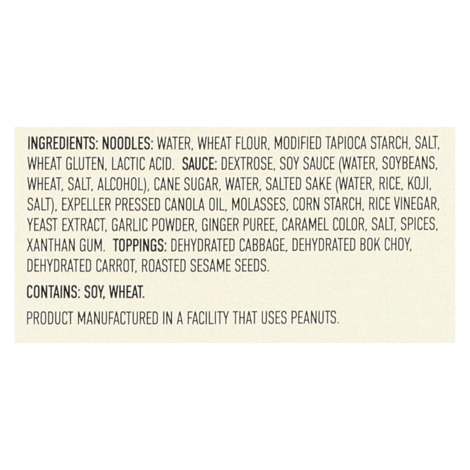 ingredients : noodles: water;wheat flour;modified tapioca starch;salt;wheat gluten;lactic acid. Sauce: dextrose;soy sauce;water;soybeans;wheat;alcohol;cane sugar;salted sake;rice;koji;expeller pressed canola oil;molasses;corn starch;rice vinegar;yeast extract;garlic powder;ginger puree;caramel color;spices;xanthan gum. Toppings: dehydrated cabbage;dehydrated bok choy;dehydrated carrot;roasted sesame seeds