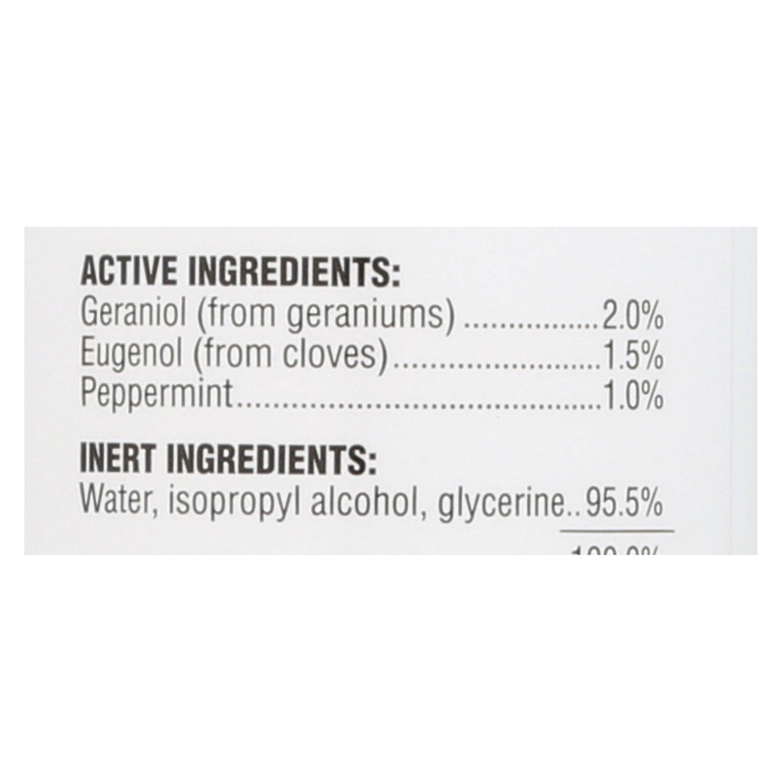 ingredients : active geraniol;from geraniums;2.0% eugenol;from cloves;1.5% peppermint 1.0% inert water;isopropyl alcohol;glycerine 95.5% / 100.0%