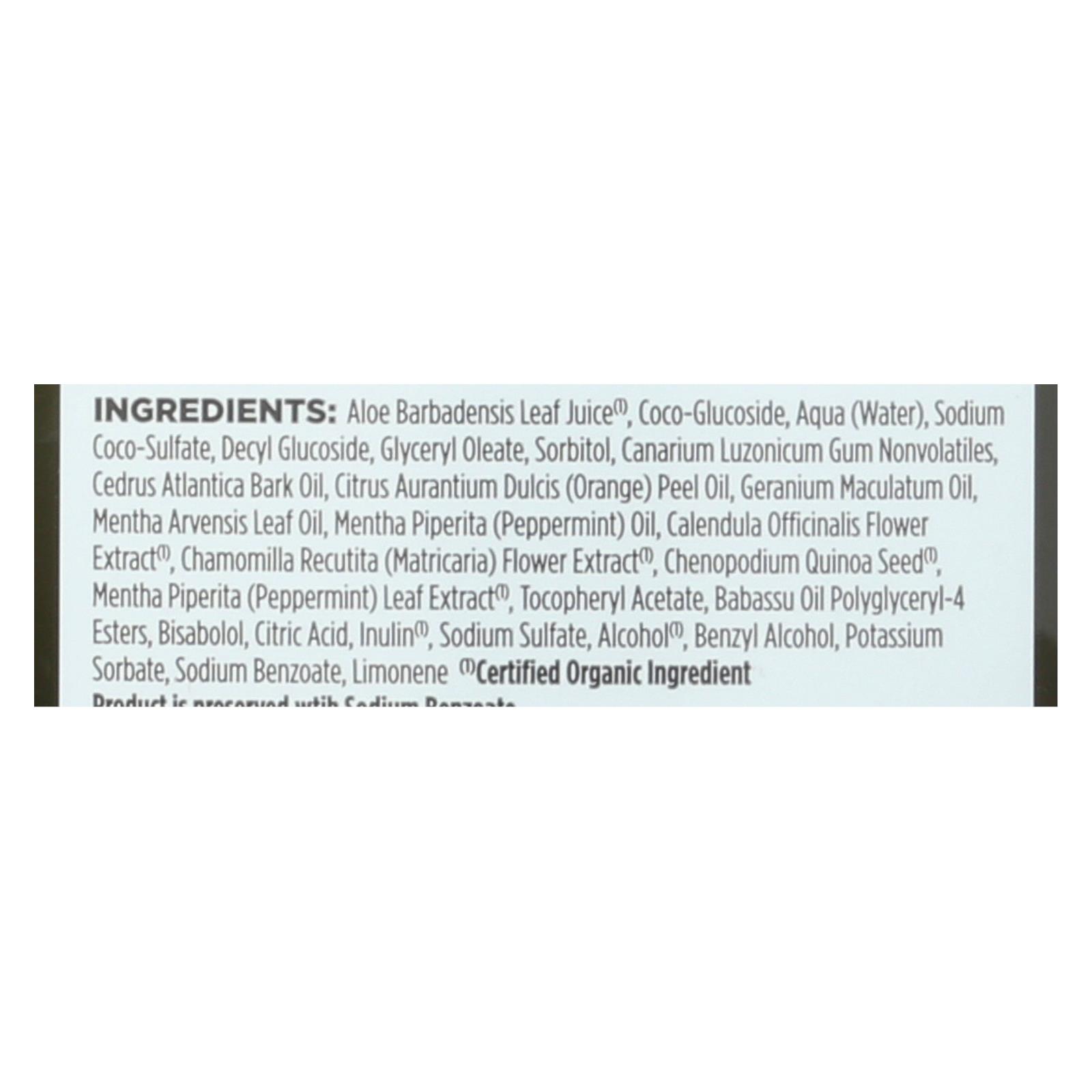 ingredients : aloe barbadensis leaf juice¹;coco-glucoside;aqua;water;sodium coco-sulfate;decyl glucoside;glyceryl oleate;sorbitol;canarium luzonicum gum nonvolatiles;cedrus atlantica bark oil;citrus aurantium dulcis;orange;peel oil;geranium maculatum oil;mentha arvensis leaf oil;mentha piperita;peppermint;oil;calendula officinalis flower extract¹;chamomilla recutita;matricaria;flower extract¹;chenopodium quinoa seed¹;leaf extract¹;tocopheryl acetate;babassu oil polyglyceryl-4 esters;bisabolol;citric acid;inul