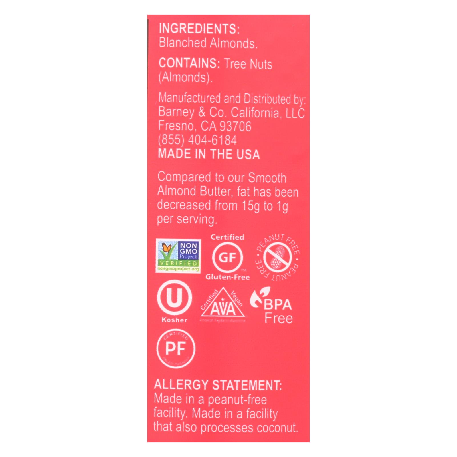 93% less fat (per serving) than out smooth almond butter. 6 g protein (per serving). 1 g fat (per serving). Non gmo project verified. Nongmoproject.org. Made with naturally defatted almonds. Why unsweetened powdered almond butter? 93% less fat (per serving). 43% fewer carbs (per serving). Only 45 cals (per serving). 6 grams per protein (per serving). Expeller-pressed. Naturally processed. Certified gluten-free. Peanut free. Certified vegan: american vegetarian association. Certified paleo. Compare to our smooth almonds butter, fat has been decreased from 15 g to 1 g per serving. Barneybutter.com. Follow us: facebook. Twitter. Instagram. Pinterest. Bpa free. Made in the usa.