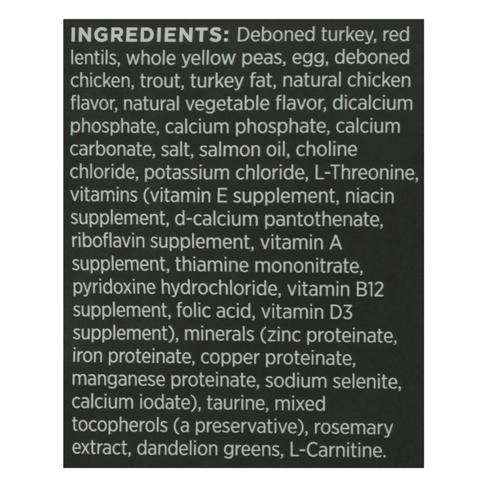 ingredients : deboned turkey;red lentils;whole yellow peas;egg;deboned chicken;trout;turkey fat;natural chicken flavor;natural vegetable flavor;dicalcium phosphate;calcium phosphate;calcium carbonate;salt;salmon oil;choline chloride;potassium chloride;l-threonine;vitamins (vitamin e supplement, niacin supplement, d-calcium pantothenate, riboflavin supplement, vitamin a supplement, thiamine mononitrate, pyridoxine hydrochloride, vitamin b12 supplement, folic acid, vitamin d3 supplement);minerals (zinc proteina