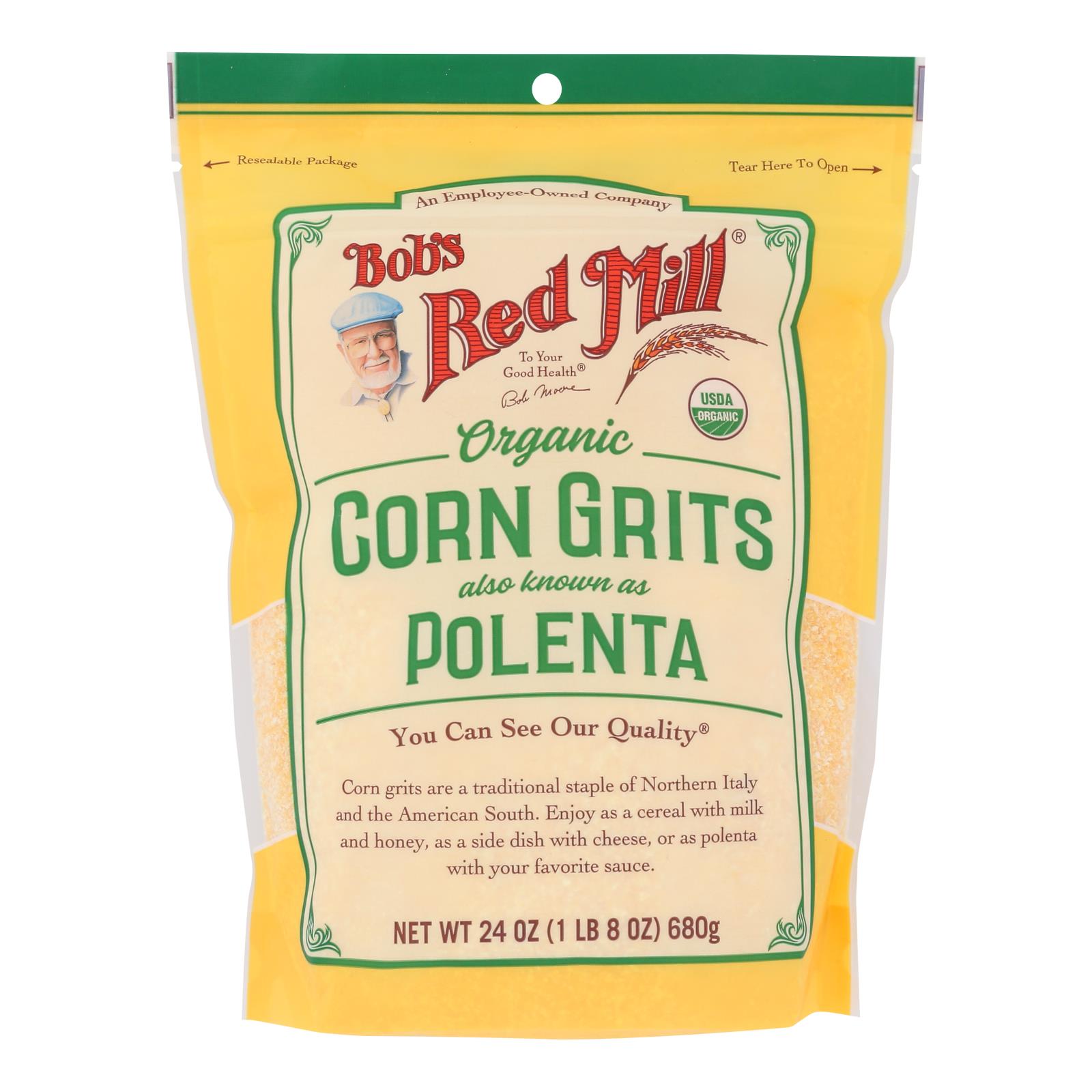 Usda organic. Certified organic by qai. To your good health – bob moore. Corn grits are a traditional staple of northern italy and the american south. Enjoy as a cereal with milk and honey, as a side dish with cheese, or as polenta with your favorite sauce. Dear friends, corn is perhaps the most traditional of american foods. Domesticated thousands of years ago, it’s been a cultural and nutritional mainstay ever since. At bob’s red mill, we use only the finest-quality golden corn to create our traditional corn grits. Their rich flavor and incredible texture make our grits ideal for porridge, polenta and any number of entrees. We hope you enjoy them as much as we do. To your good health, bob moore. Bobsredmill.com. For information and recipes, visit bobsredmill.com. An employee-owned company. Resealable package.