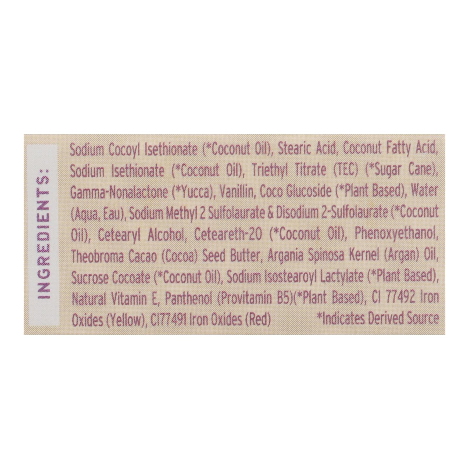 ingredients : sodium cocoyl isethionate (*coconut oil);stearic acid;coconut fatty acid;sodium isethionate (*coconut oil);triethyl titrate (tec) (*sugar cane);gamma-nonalactone (*yucca);vanillin;coco glucoside (*plant based);water (aqua, eau);sodium methyl 2 sulfolaurate & disodium 2-sulfolaurate (*coconut oil);cetearyl alcohol;ceteareth-20 (*coconut oil);phenoxyethanol;theobroma cacao (cocoa) seed butter;argania spinosa kernel (argan) oil;sucrose cocoate (*coconut oil);sodium isostearoyl lactylate (*plant