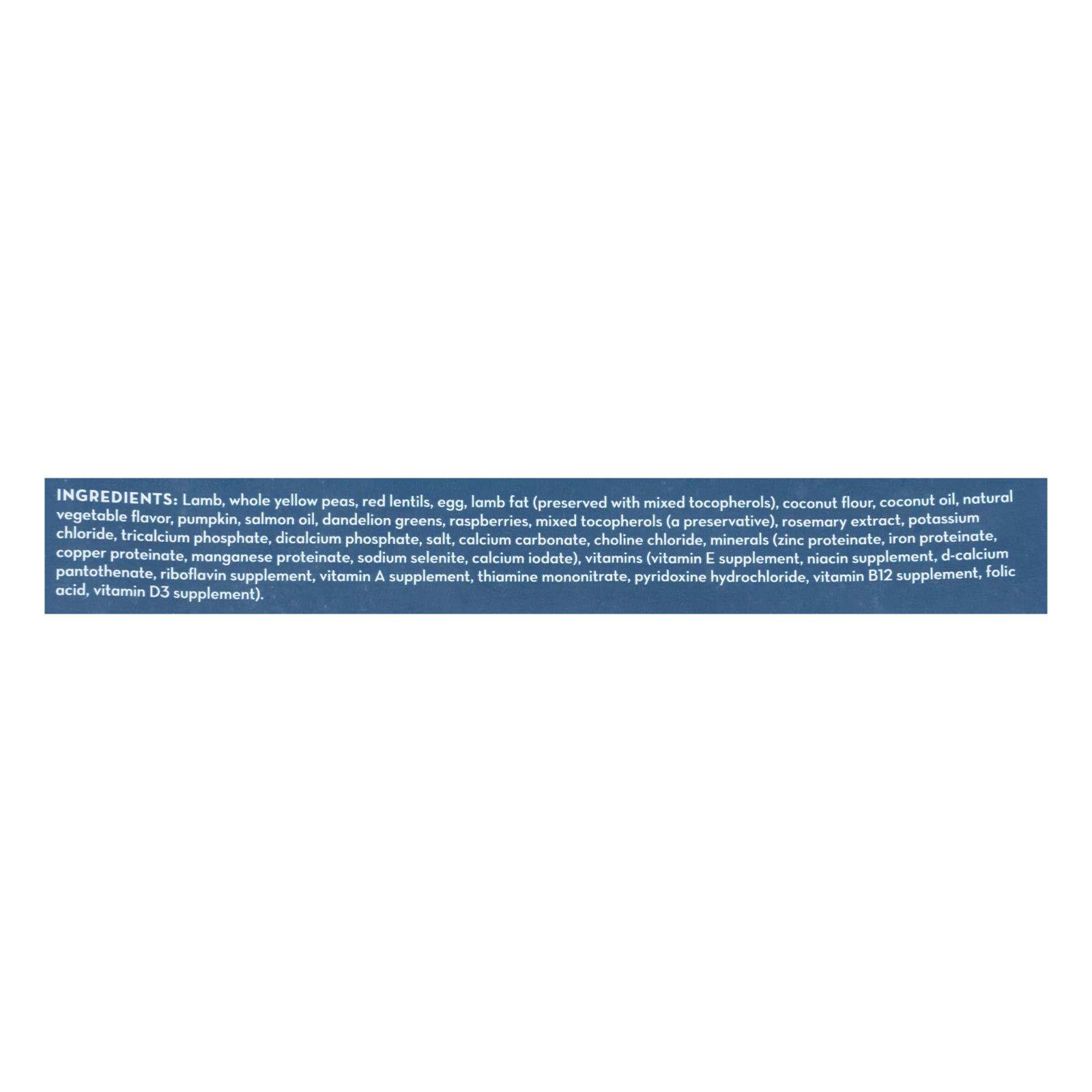 ingredients : lamb;whole yellow peas;red lentils;egg;lamb fat;preserved with mixed tocopherols;coconut flour;coconut oil;natural vegetable flavor;pumpkin;salmon oil;dandelion greens;raspberries;mixed tocopherols;a preservative;rosemary extract;potassium chloride;tricalcium phosphate;dicalcium phosphate;salt;calcium carbonate;choline chloride;minerals;zinc proteinate;iron proteinate;copper proteinate;manganese proteinate;sodium selenite;calcium iodate;vitamins;vitamin e supplement;niacin supplement;d-calciump