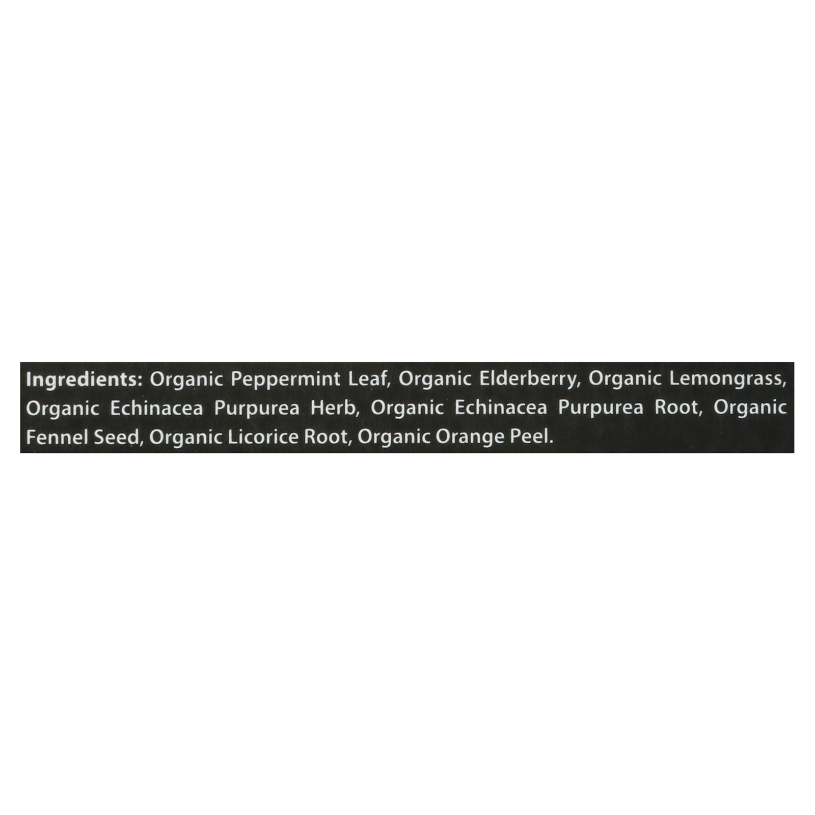 ingredients : organic peppermint leaf;organic elderberry;organic lemongrass;organic echinacea purpurea herb;organic echinacea purpurea root;organic fennel seed;organic licorice root;organic orange peel