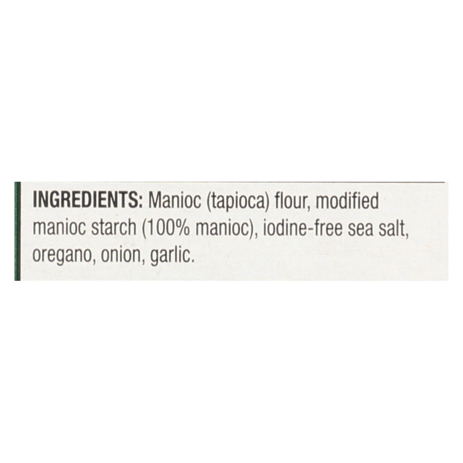 ingredients : manioc;tapioca;flour;modified manioc starch;100% manioc;iodine-free sea salt;oregano;onion;garlic
