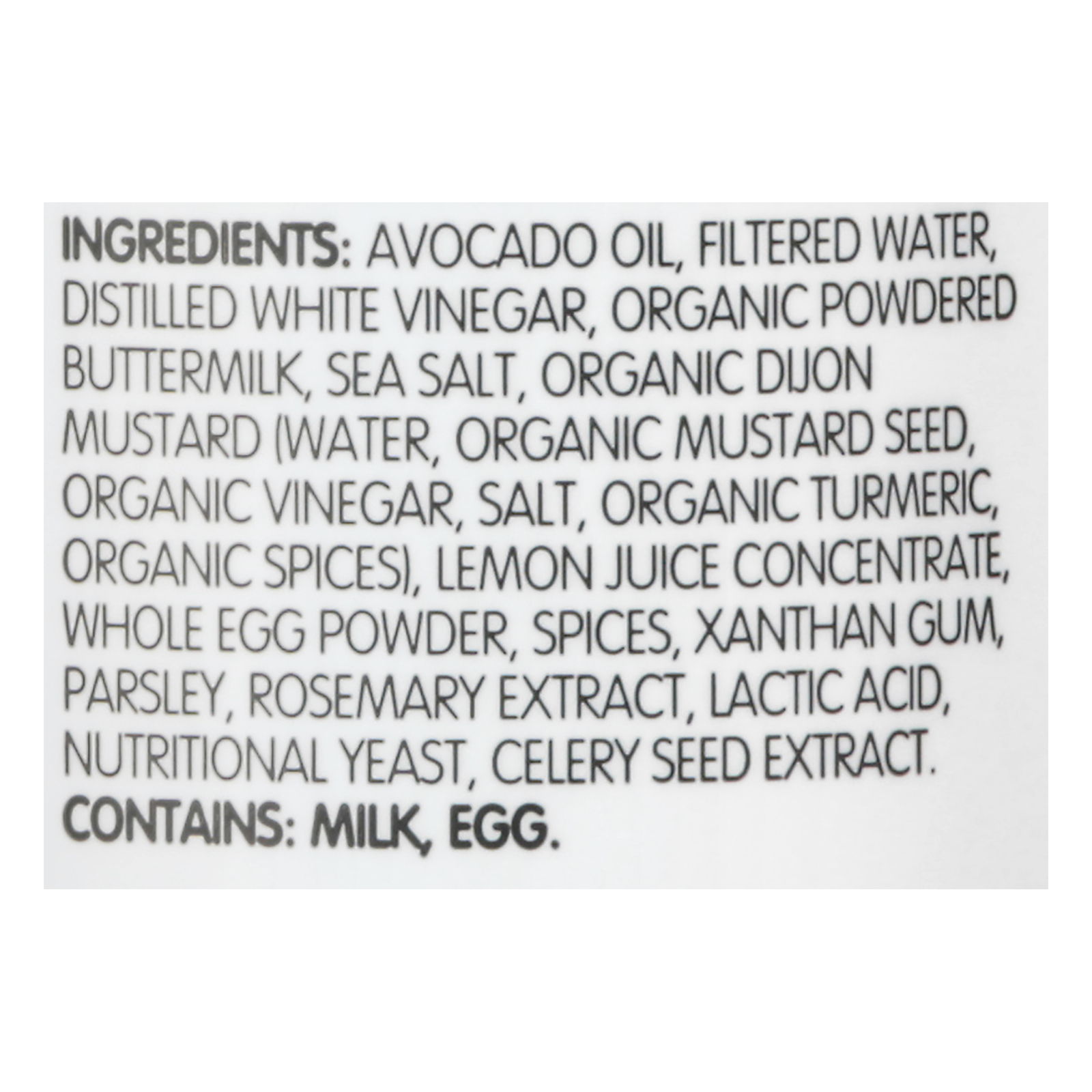 ingredients : avocado oil;filtered water;distilled vinegar;lemon juice from concentrate (water, lemon juice concentrate);egg yolks;less than 2%: salt, garlic powder, onion powder, mustard (water, organic mustard seeds, organic vinegar, salt, organic turmeric, organic spices), rosemary extract (for freshness), dill weed, black pepper, chives, parsley, natural flavor, yeast extract, xanthan gum