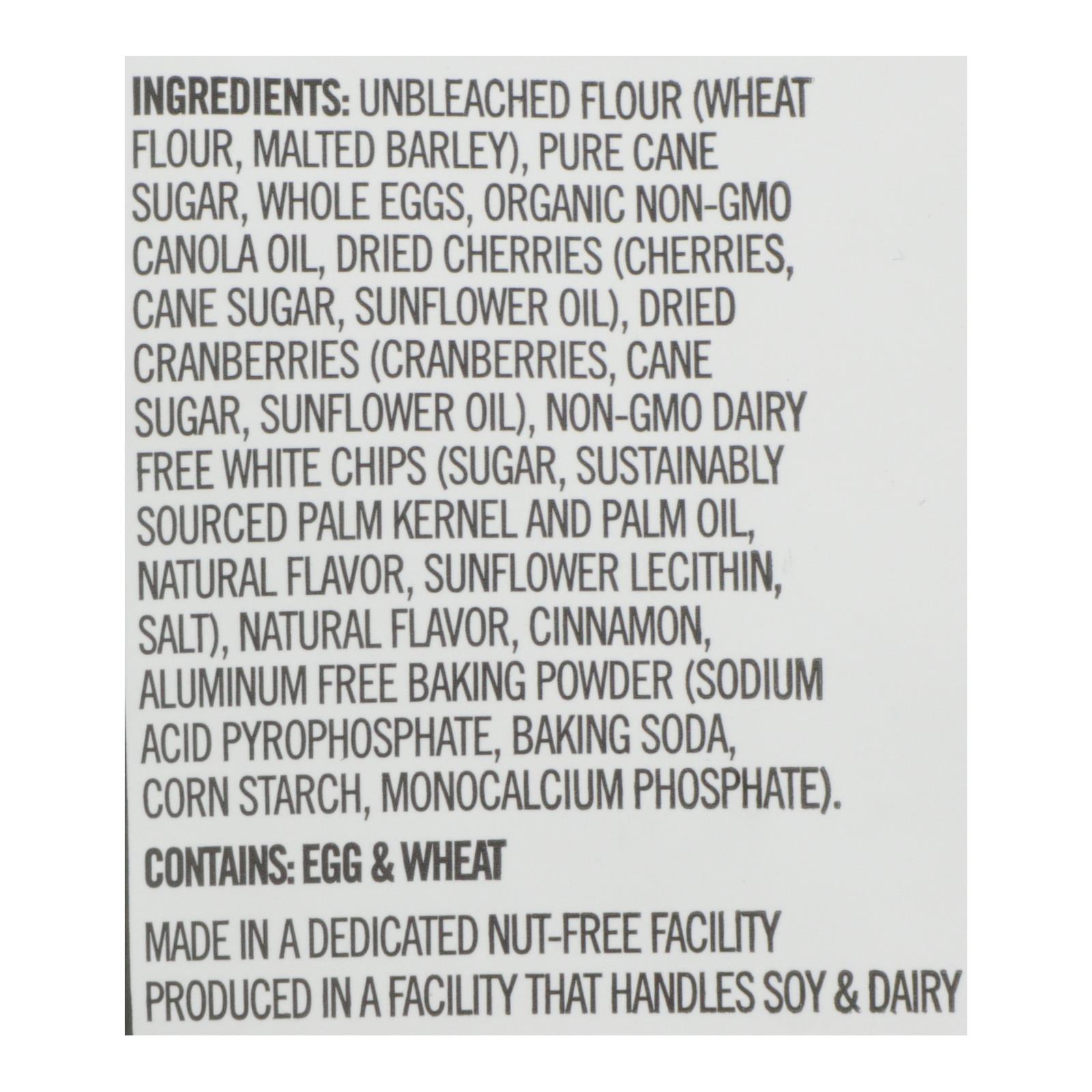 ingredients : unbleached flour (wheat flour, malted barley);pure cane sugar;whole eggs;organic non-gmo canola oil;dried cherries (cherries, cane sugar, sunflower oil);dried cranberries (cranberries, cane sugar, sunflower oil);non-gmo dairy free white chips (sugar, sustainably sourced palm kernel and pal oil, natural flavor, sunflower lecithin, salt);natural flavor;cinnamon;aluminum free baking powder (sodium acid pyrophosphate, baking soda, corn starch, monocalcium phosphate)