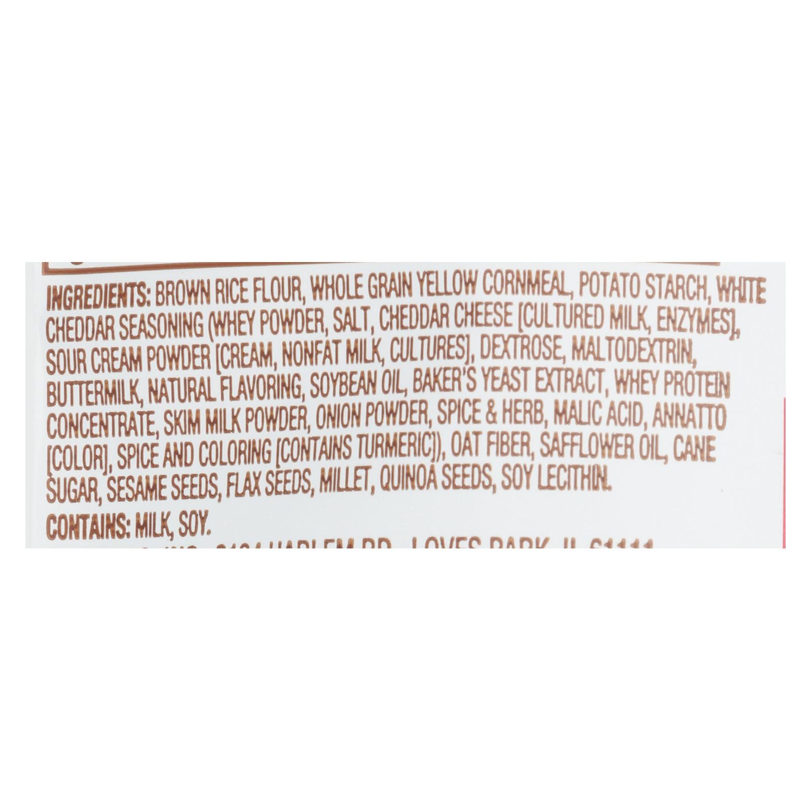 ingredients : brown rice flour;whole grain yellow cornmeal;potato starch;white cheddar seasoning (whey powder, salt, cheddar cheese [cultured milk, enzymes], sour cream powder [cream, nonfat milk, cultures], dextrose, maltodextrin, buttermilk, natural flavoring, soybean oil, baker’s yeast extract, whey protein concentrate, skim milk powder, onion powder, spice & herb, malic acid, annatto [color], spice and coloring [contains turmeric]);oat fiber;safflower oil;cane sugar;sesame seeds;flax seeds;millet;quin