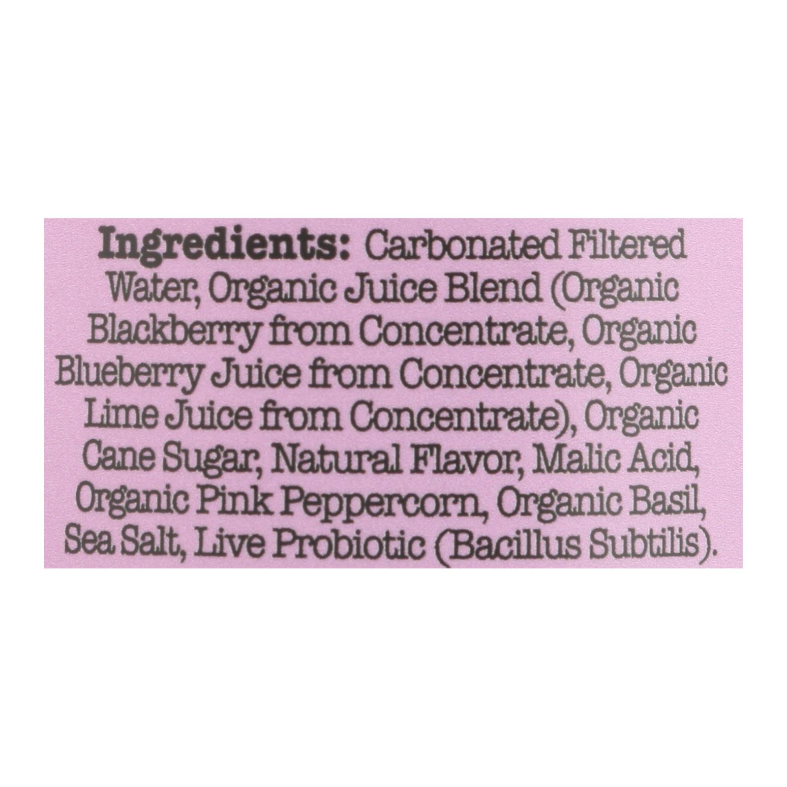 ingredients : carbonated filtered water;organic juice blend from concentrate (pear, blackberry, blueberry and lime);natural flavor;malic acid;organic pink peppercorn;organic basil;sea salt;live probiotic (bacillus subtilis)