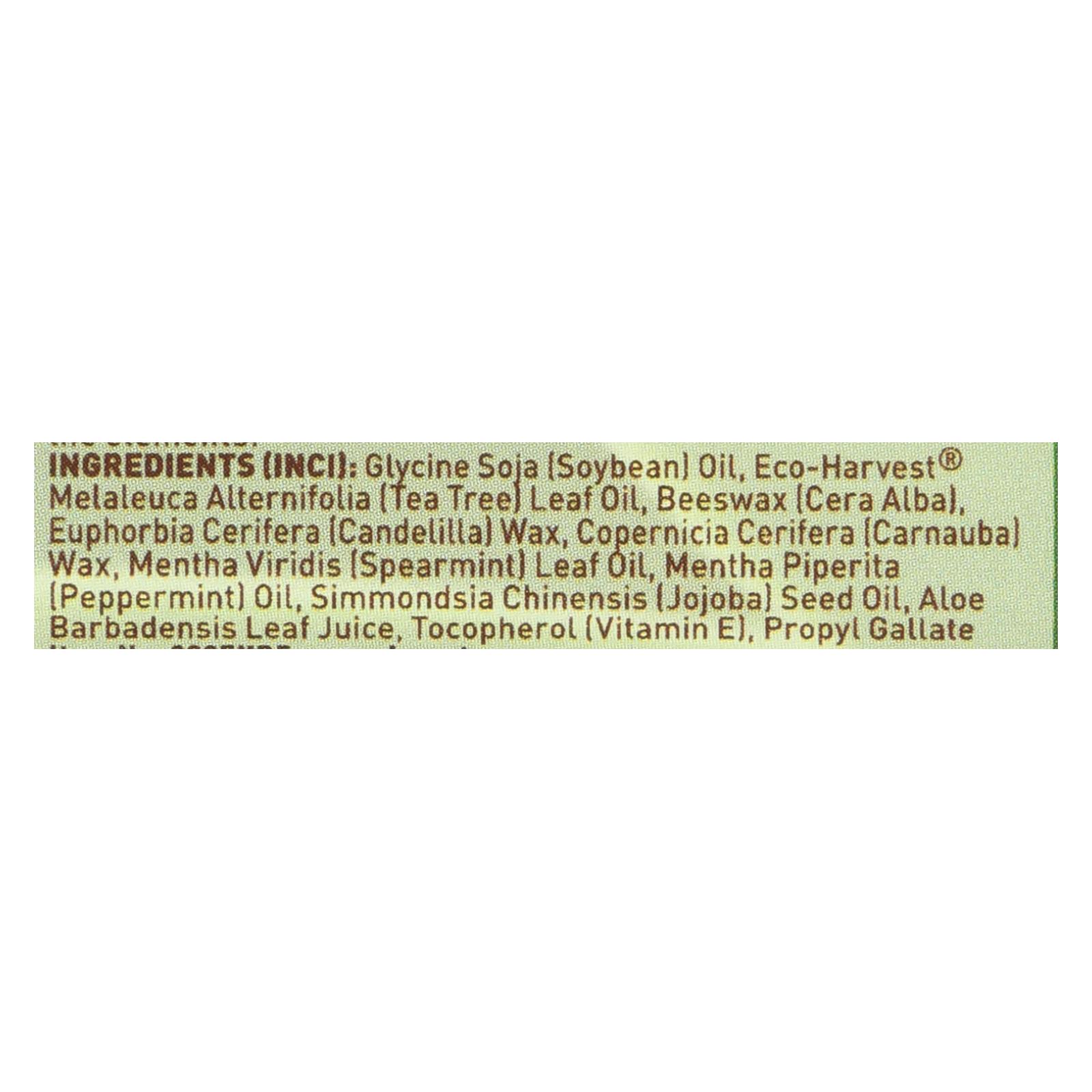 ingredients : glycine soja;soybean;oil;eco-harvest® melaleuca alternifolia;tea tree;leaf oil;beeswax;cera alba;euphorbia cerifera;candelilla;wax;copernicia cerifera;carnauba;mentha viridis;spearmint;mentha piperita;peppermint;simmondsia chinesis;jojoba;seed oil;aloe barbadensis leaf juice;tocopherol;vitamin e;propyl gallate