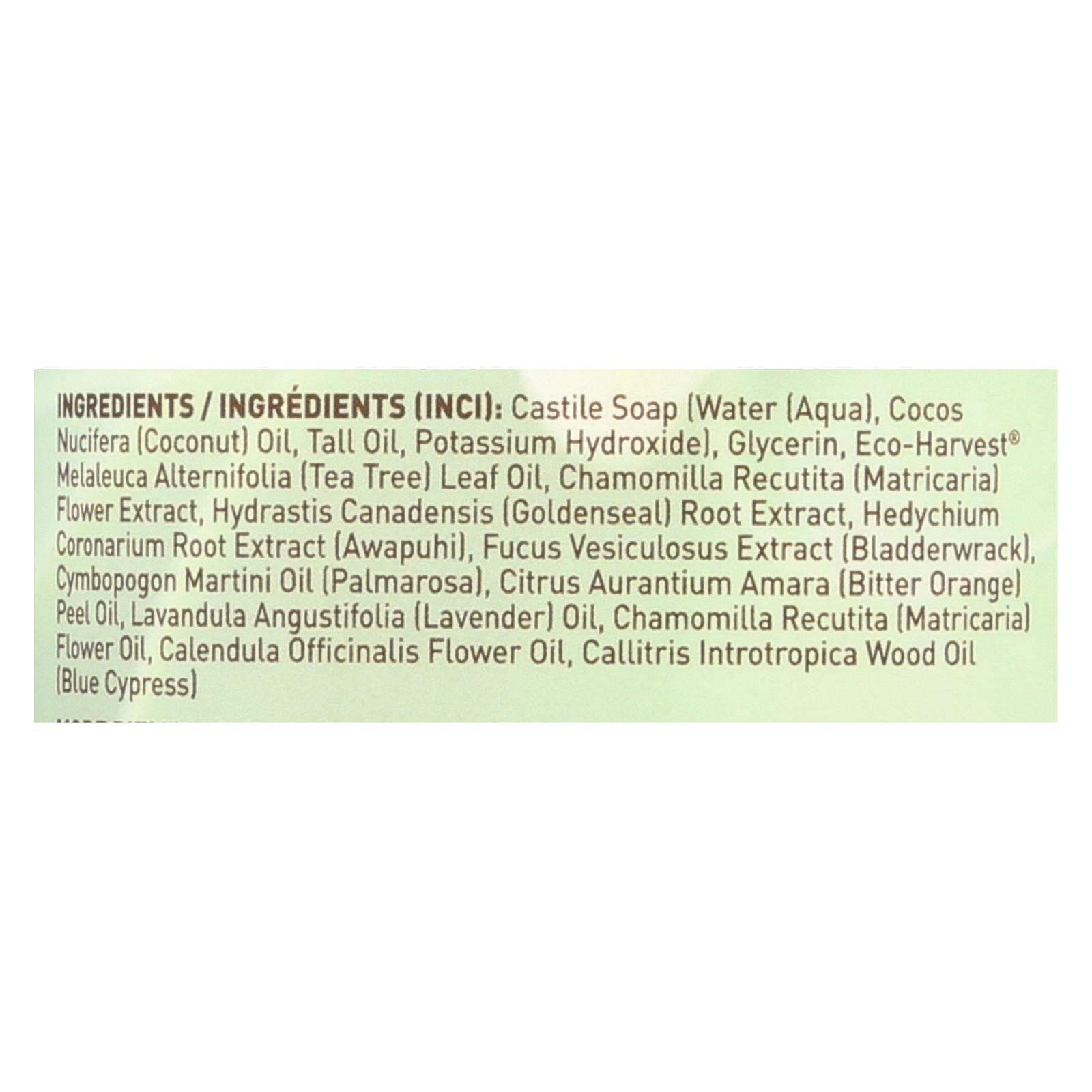 ingredients : castile soap;water;aqua;cocos nucifera;coconut;oil;tall oil;potassium hydroxide;glycerin;eco-harvest® melaleuca alternifolia;tea tree;leaf oil;chamomilla recutita;matricaria;flower extract;hydrastis canadensis;goldenseal;root extract;hedychium coronarium root extract;awapuhi;fucus vesiculosus extract;bladderwrack;cymbopogon martini oil;palmarosa;citrus aurantium amara;bitter orange;peel oil;lavandula angustifolia;lavender;flower oil;calendula officinalis flower oil;callitris introtropica wood oi