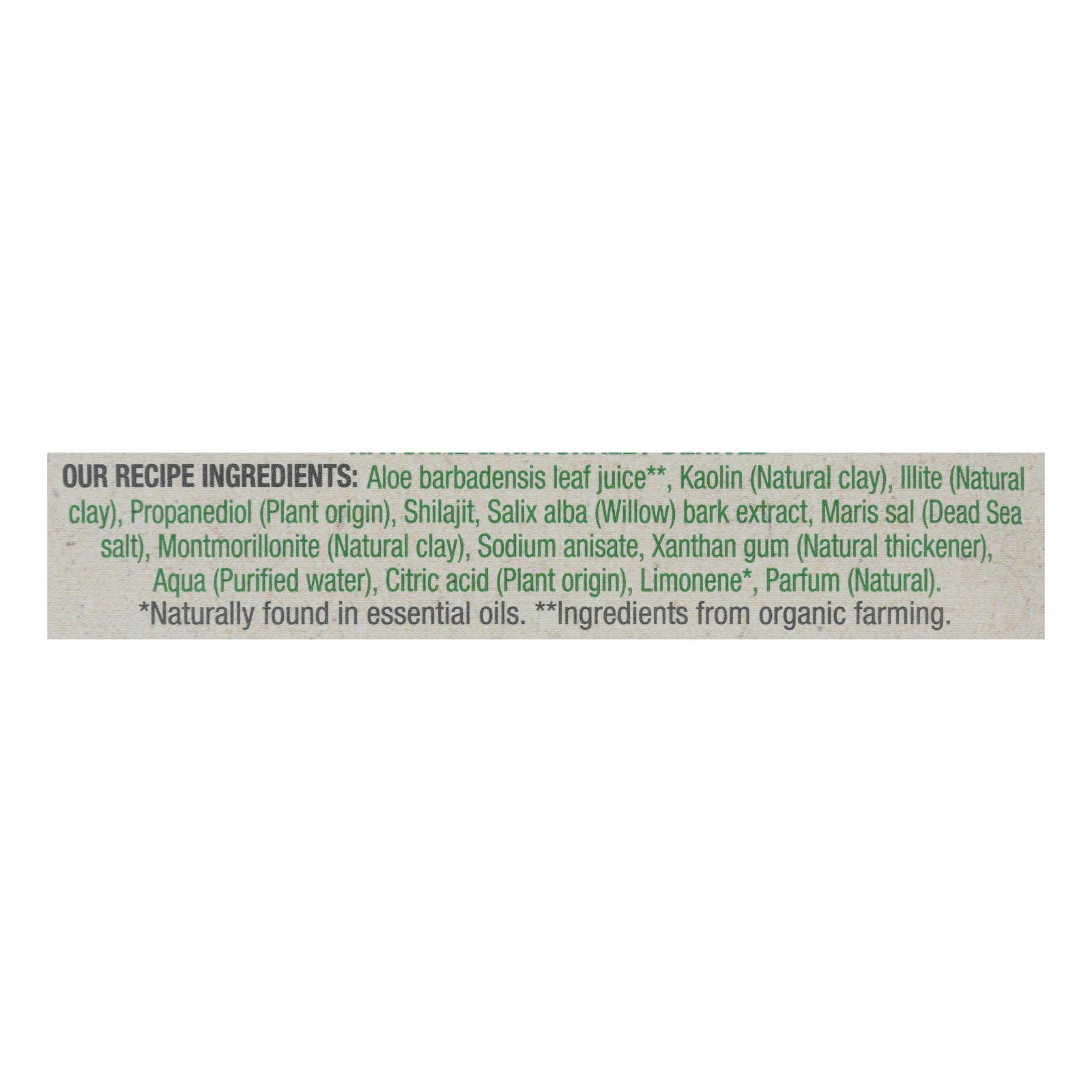 ingredients : aloe barbadensis leaf juice;kaolin (natural clay);illite (natural clay);propanediol (plant origin);shilajit;salix alba (willow) bark extract;maris sal (dead sea salt);montmorillonite (natural clay);sodium anisate;xanthan gum (natural thickener);aqua (purified water);citric acid (plant origin);limonene;parfum (natural)