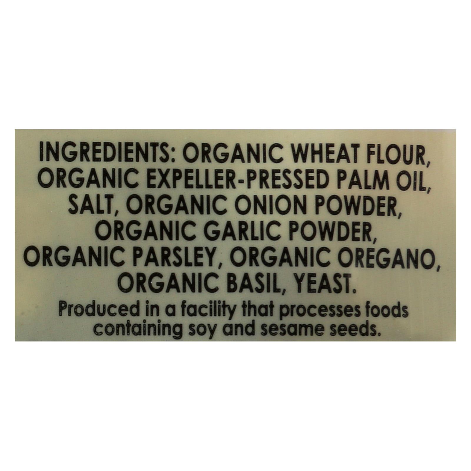 ingredients : organic wheat flour;organic expeller-pressed palm oil;salt;organic onion powder;organic garlic powder;organic parsley;organic oregano;organic basil;yeast
