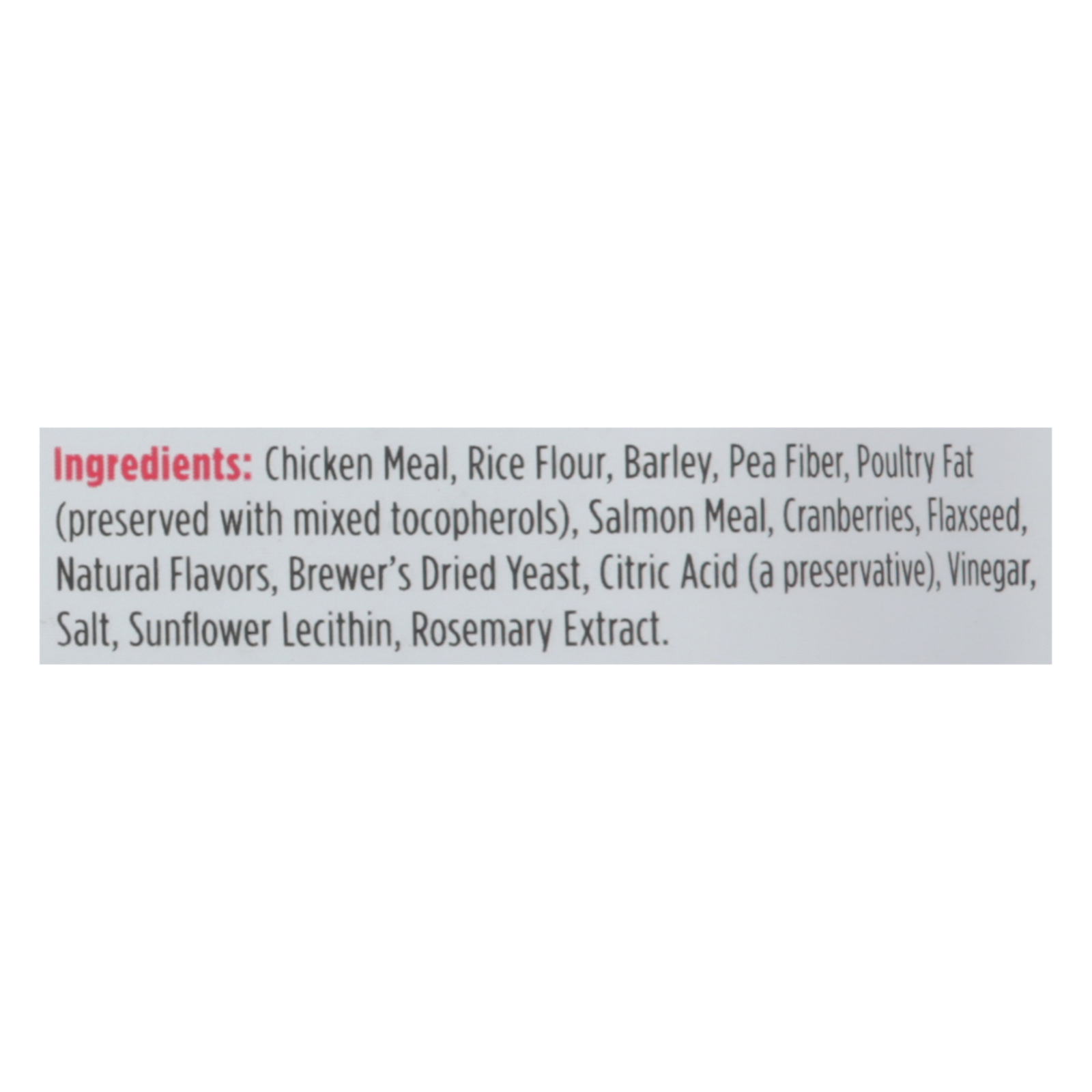 ingredients : chicken meal;rice flour;barley;pea fiber;poultry fat (preserved with mixed tocopherols);salmon meal;cranberries;flaxseed;natural flavors;brewer’s dried yeast;citric acid (a preservative);vinegar;salt;sunflower lecithin;rosemary extract