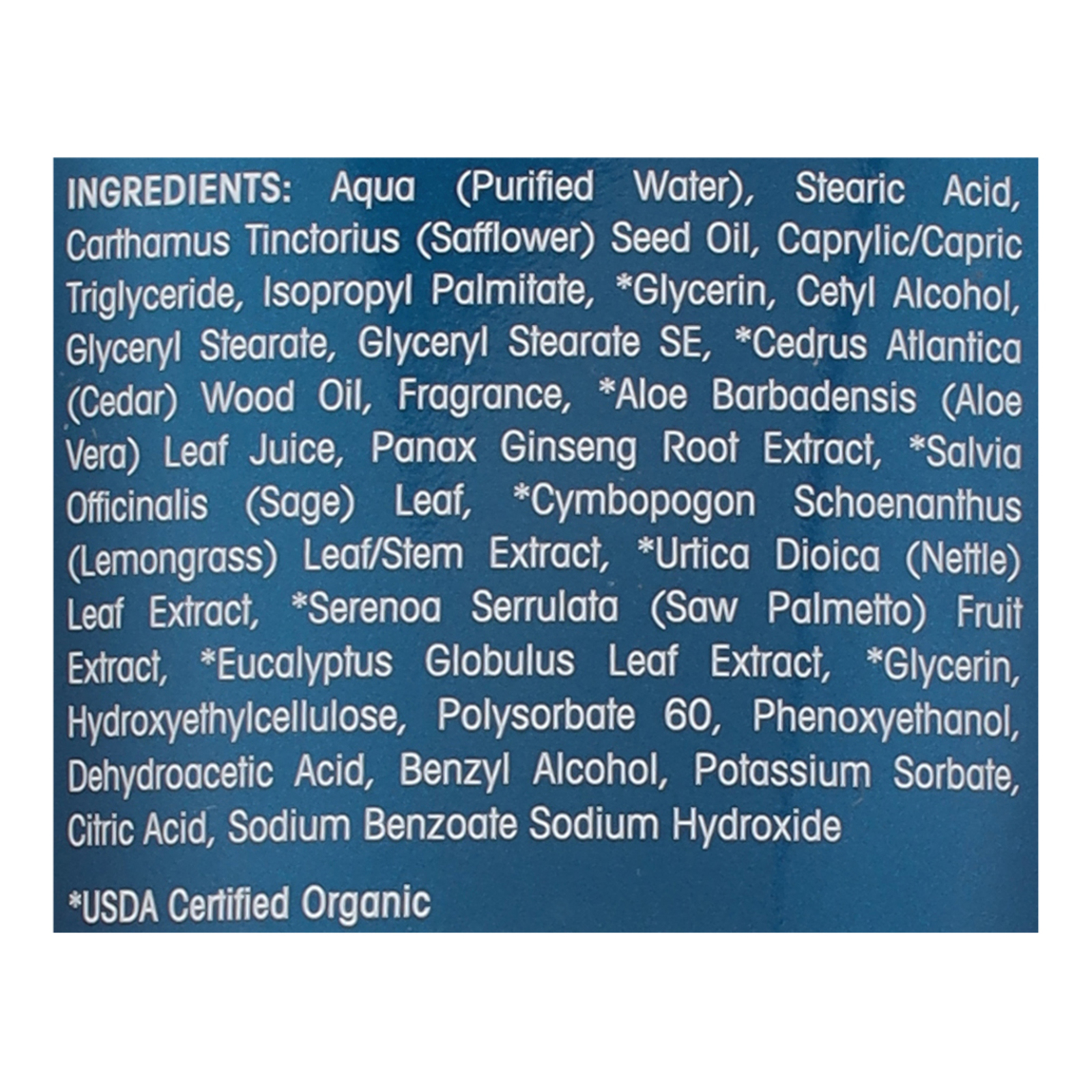 ingredients : aqua (purified water);stearic acid;carthamus tinctorius (safflower) seed oil;caprylic/capric triglyceride;isopropyl palmitate;glycerin;cetyl alcohol;glyceryl stearate;glyceryl stearate se;cedrus atlantica (cedar) wood oil;fragrance;aloe barbadensis (aloe vera) leaf juice;panax ginseng root extract;salvia officinalis (sage) leaf;cymbopogon schoenanthus (lemongrass) leaf/stem extract;urtica dioica (nettle) leaf extract;serenoa serrulata (saw palmetto) fruit extract;eucalyptus globulus leaf extract