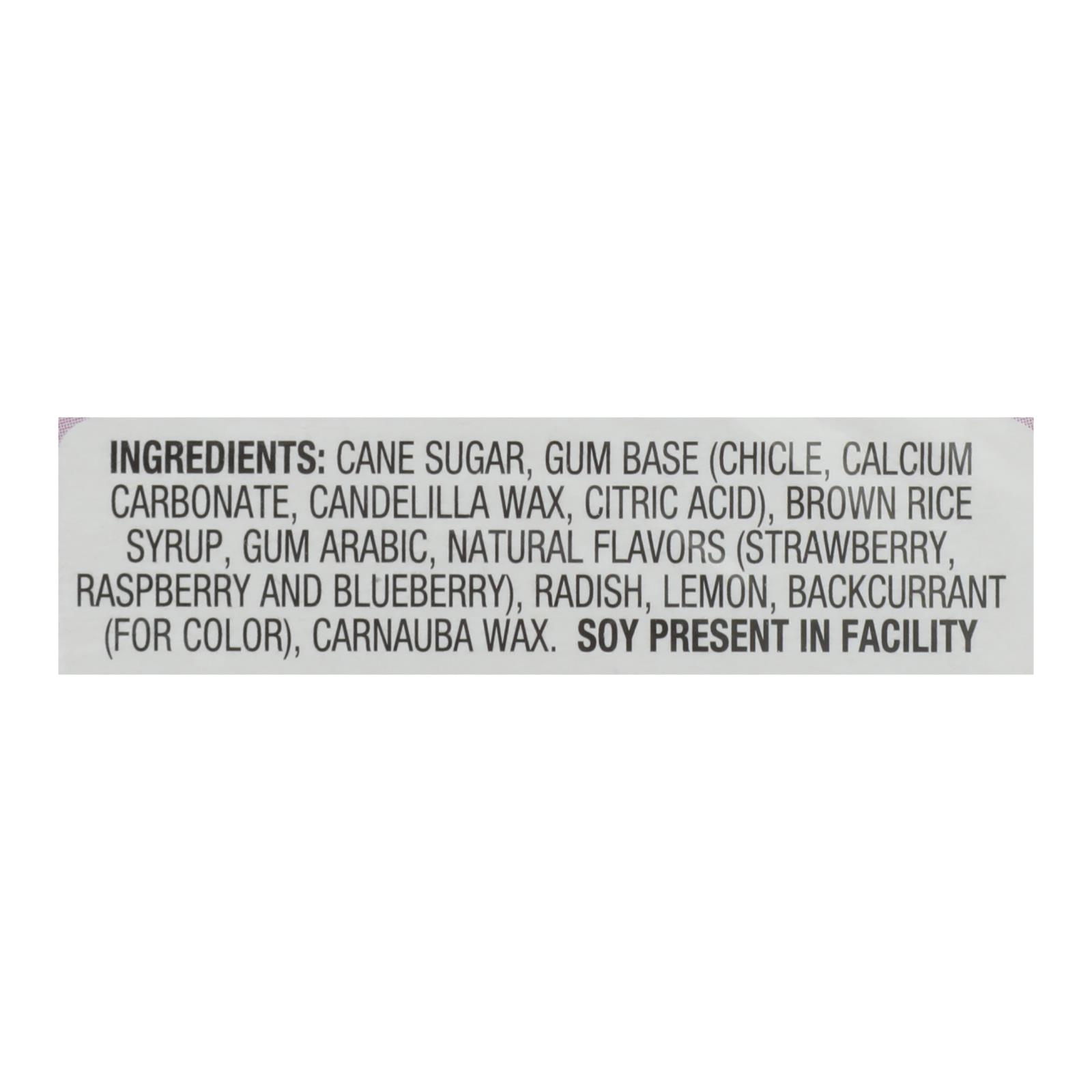 ingredients : cane sugar;gum base;chicle;calcium carbonate;candelilla wax;citric acid;brown rice syrup;gum arabic;natural flavors;strawberry;raspberry and blueberry;radish;lemon;blackcurrant;for color;carnauba wax