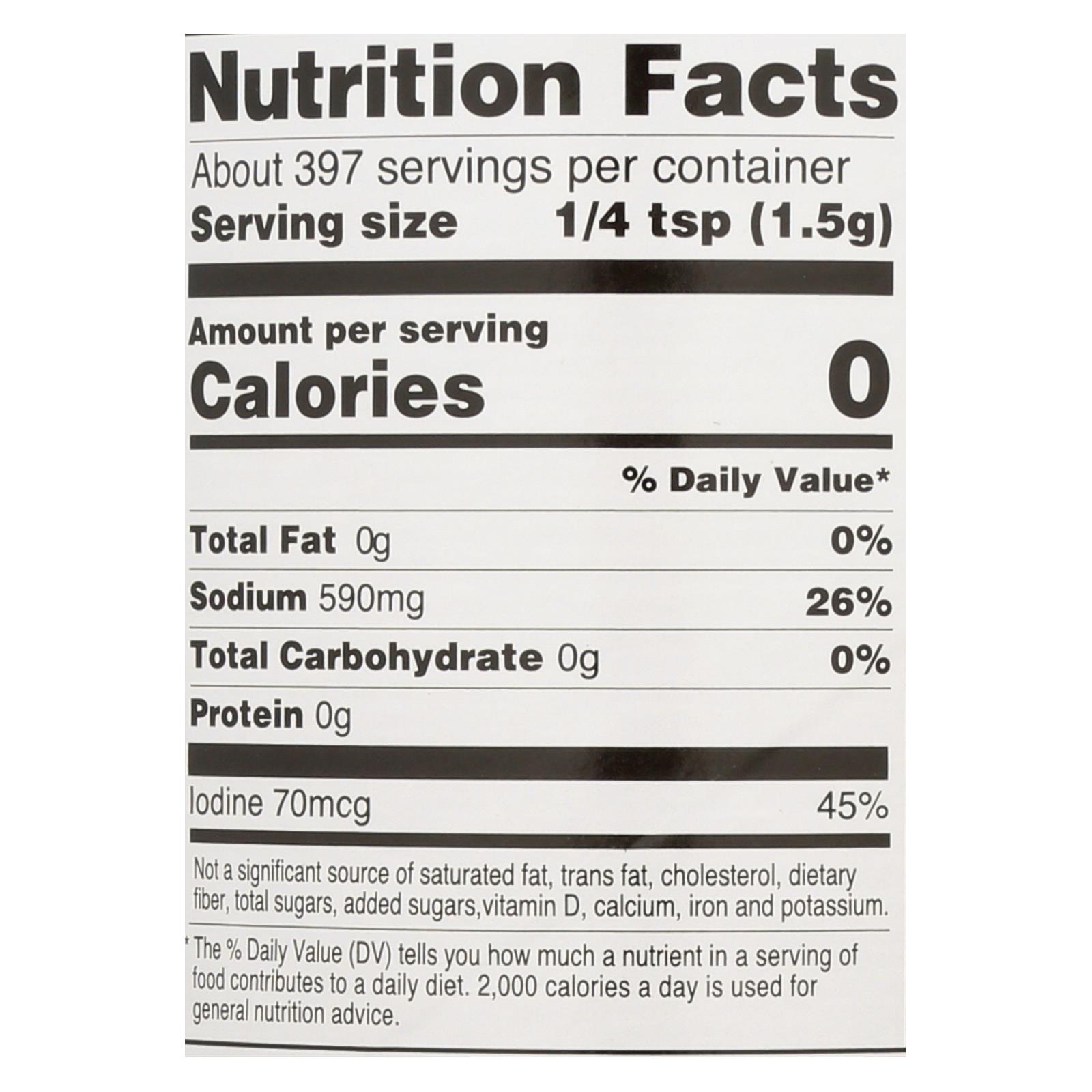Hain pure foods iodized sea salt is obtained from evaporated ocean water. An excellent source of iodine, an essential nutrient, our sea salt helps wake up the flavors of cooked foods, including meats, stews, soups and vegetables. Keep a carton in your pantry for cooking or for use at the table. The 21 oz. Carton includes a convenient dual spout for easy dispensing. One serving provides 45% of the recommended daily value of iodine and 26% of the recommended daily value of sodium.