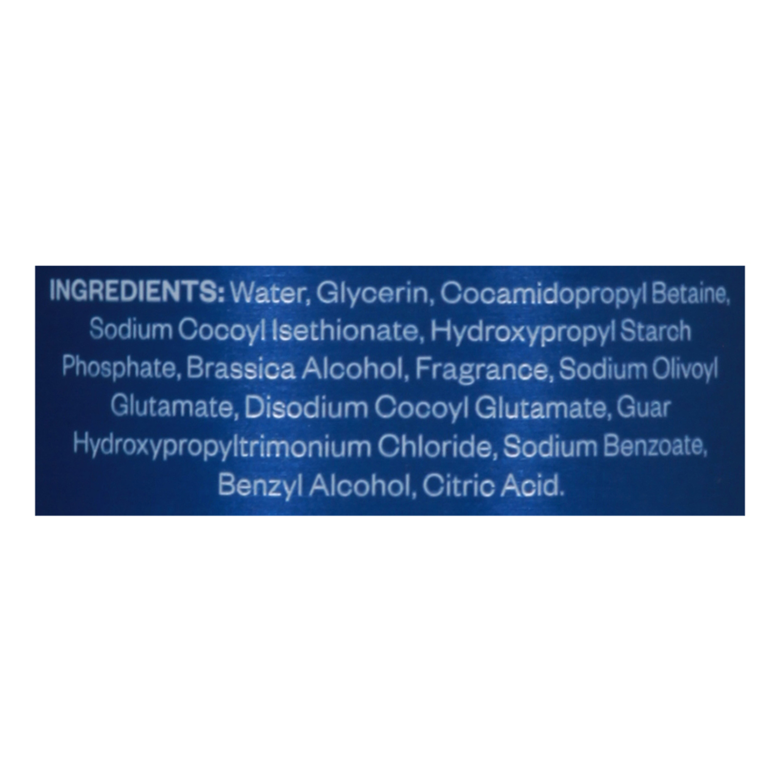 ingredients : water;glycerin;cocamidopropyl betaine;sodium cocoyl isethionate;hydroxypropyl starch phosphate;brassica alcohol;fragrance;sodium olivoyl glutamate;disodium cocoyl glutamate;guar hydroxypropyltrimonium chloride;sodium benzoate;benzyl alcohol;citric acid