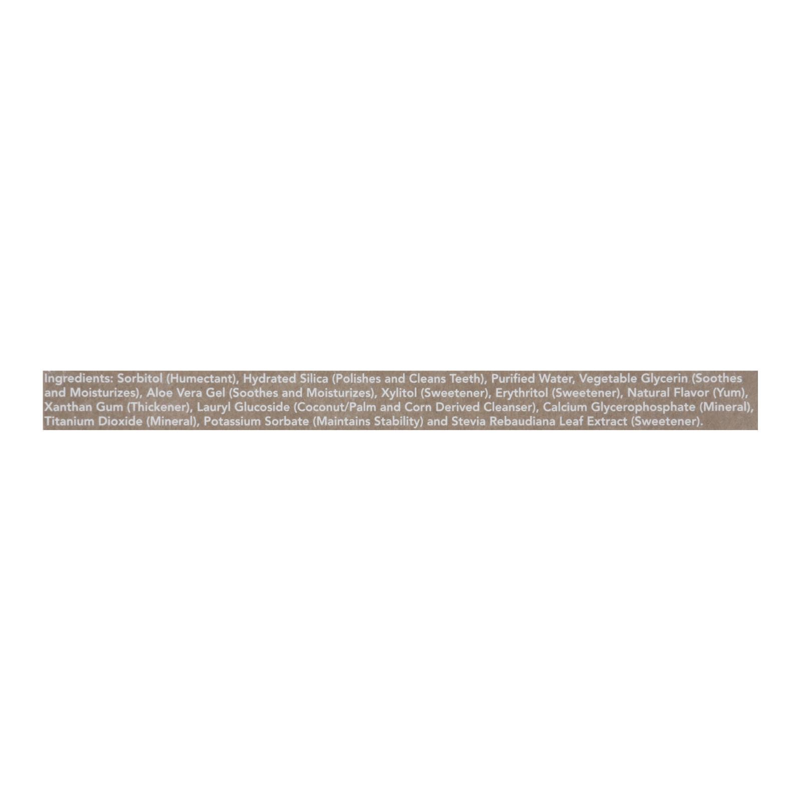 ingredients : sorbitol;humectant;hydrated silica;polishes and cleans teeth;purified water;vegetable glycerin;soothes and moisturizes;aloe vera gel;xylitol;sweetener;erythritol;natural flavor;yum;xanthan gum;thickener;lauryl glucoside;coconut/palm and corn derived cleanser;calcium glycerophosphate;mineral;titanium dioxide;potassium sorbate;maintain stability;and stevia rebaudiana leaf extract