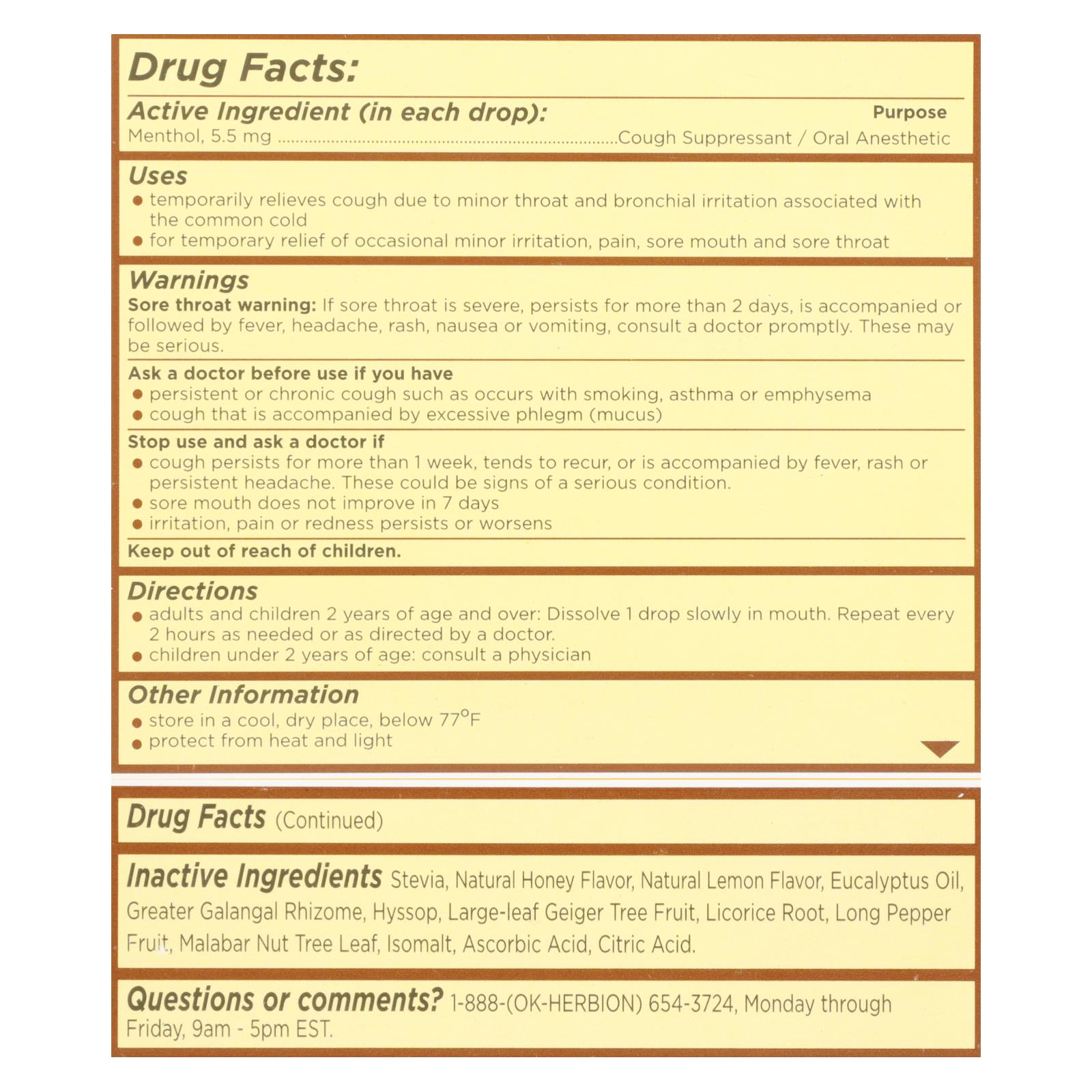 Herbion naturals honey lemon cough drops contain menthol to help relieve a painful cough or sore throat associated with the common cold. Each 18 count box of cough drops can also help relieve occasional irritation, pain or mouth soreness. These cough drops are made with stevia for a sugar-free alternative to other types of cough drops.