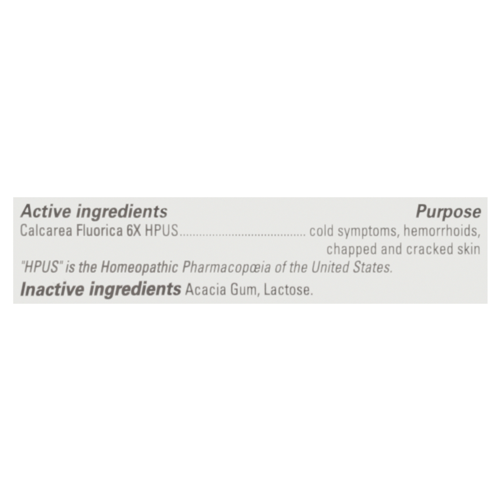 ingredients : acacia gum;lactose;calcarea fluorica 6x hpus purpose cold symptoms;hemorrhoids;chapped and cracked skin