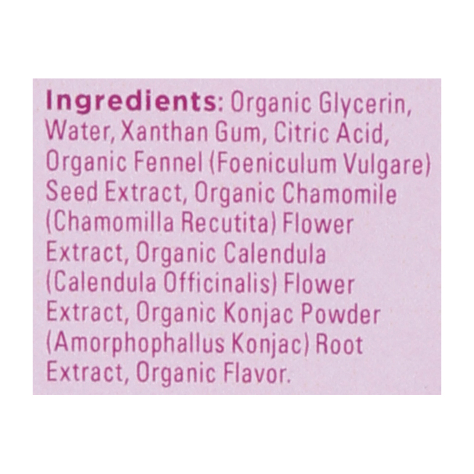 ingredients : organic glycerin;purified water;organic ginger (zingiber officinale) root extract;organic chamomile (chamomilla recutita) flower extract;organic vanilla (vanilla planifolia) bean powder;xanthan gum;organic cherry flavor;citric acid;organic konjac (amorphophallus konjac) root powder;organic fennel (foeniculum vulgare) seed extract;organic calendula (calendula officinalis) extract;organic thyme (thymus vulgaris) leaf extract