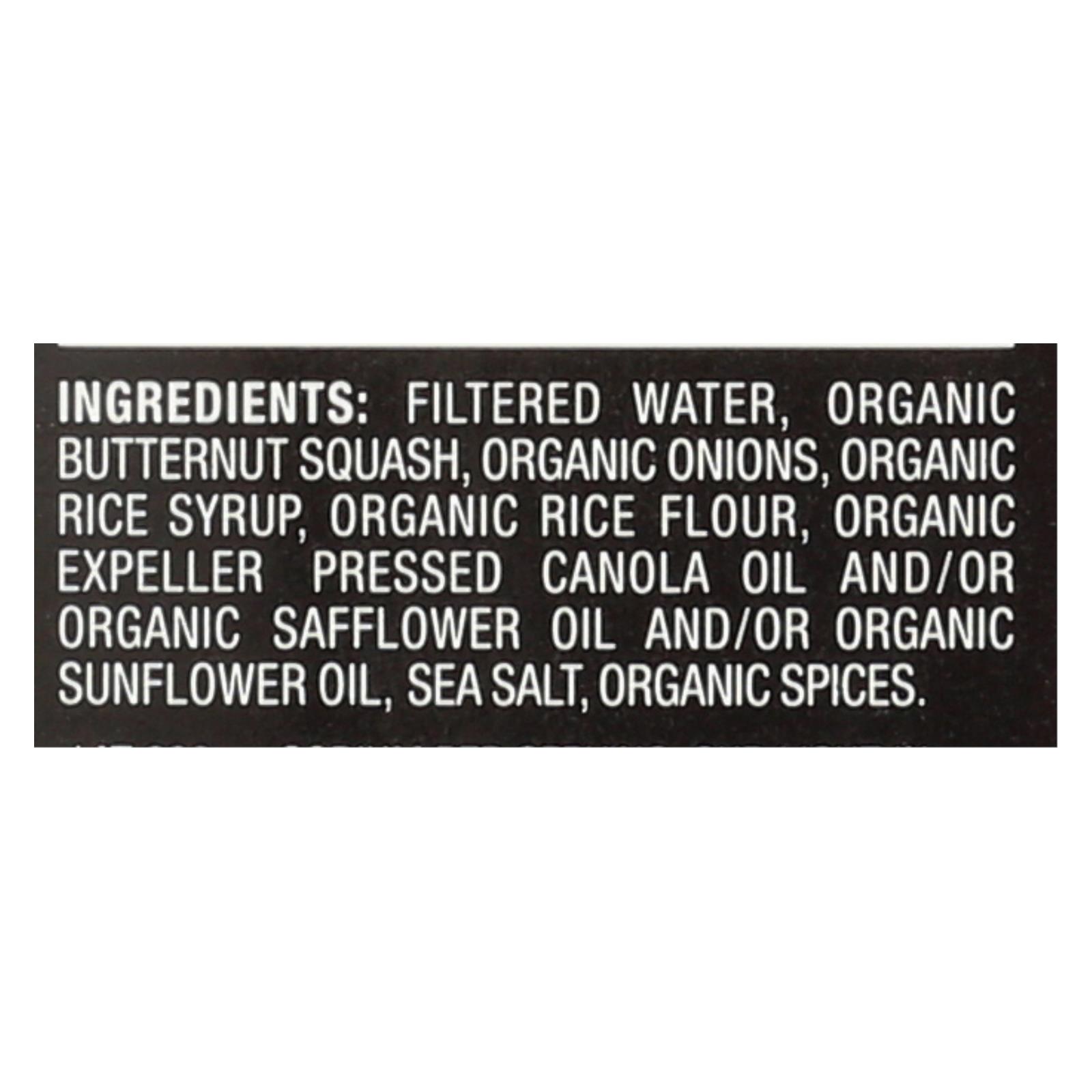 ingredients : filtered water;organic butternut squash;organic onions;organic rice syrup;organic rice flour;organic expeller pressed canola oil and/or organic safflower oil and/or organic sunflower oil;sea salt;organic spices