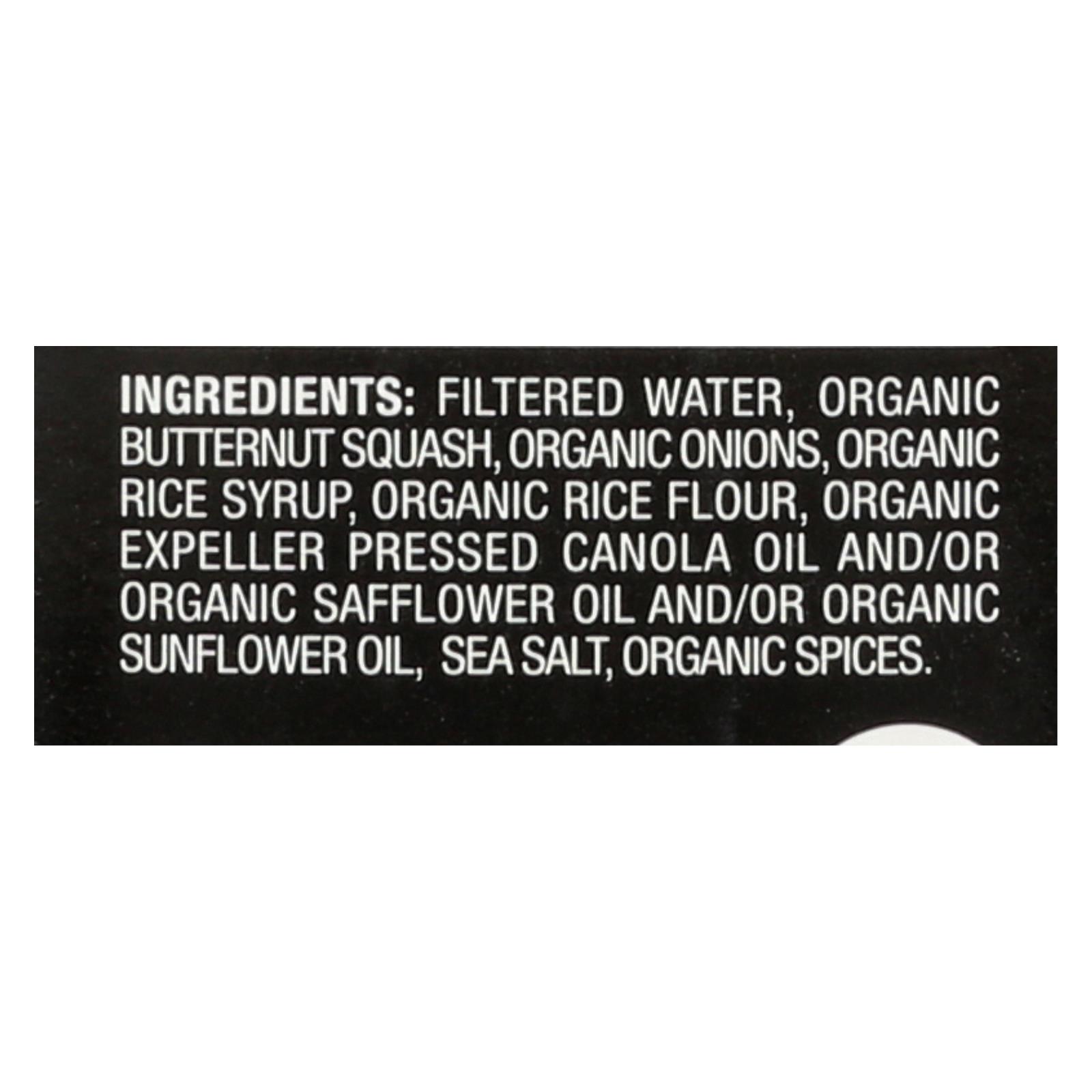 ingredients : filtered water;organic butternut squash;organic onions;organic rice syrup;organic rice flour;organic expeller pressed canola oil and/or organic safflower oil and/or organic sunflower oil;sea salt;organic spices