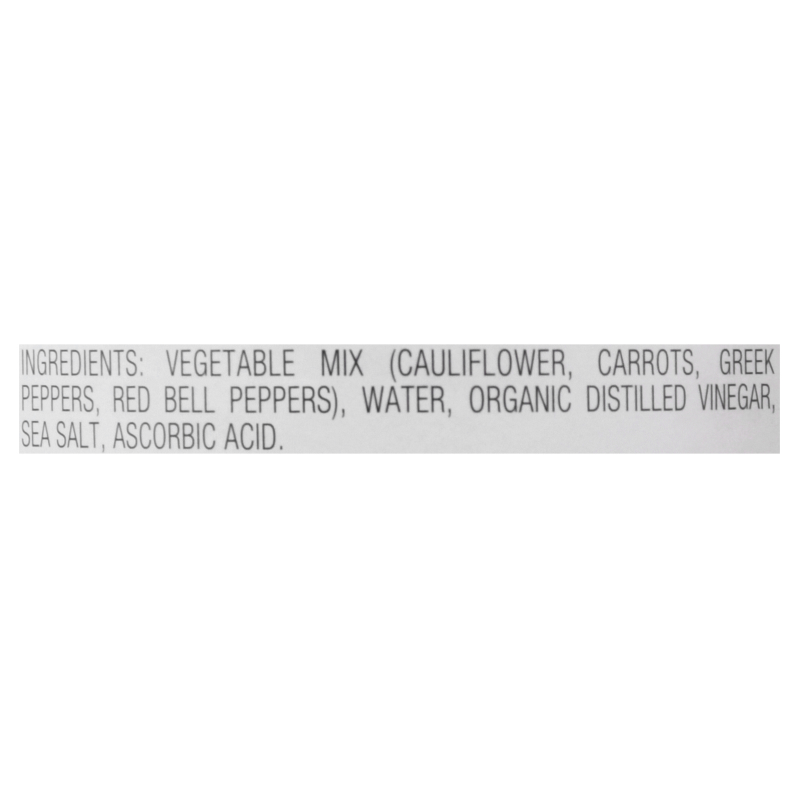 ingredients : vegetable mix;cauliflower;carrots;greek peppers;red bell peppers;water;organic distilled vinegar;sea salt;ascorbic acid