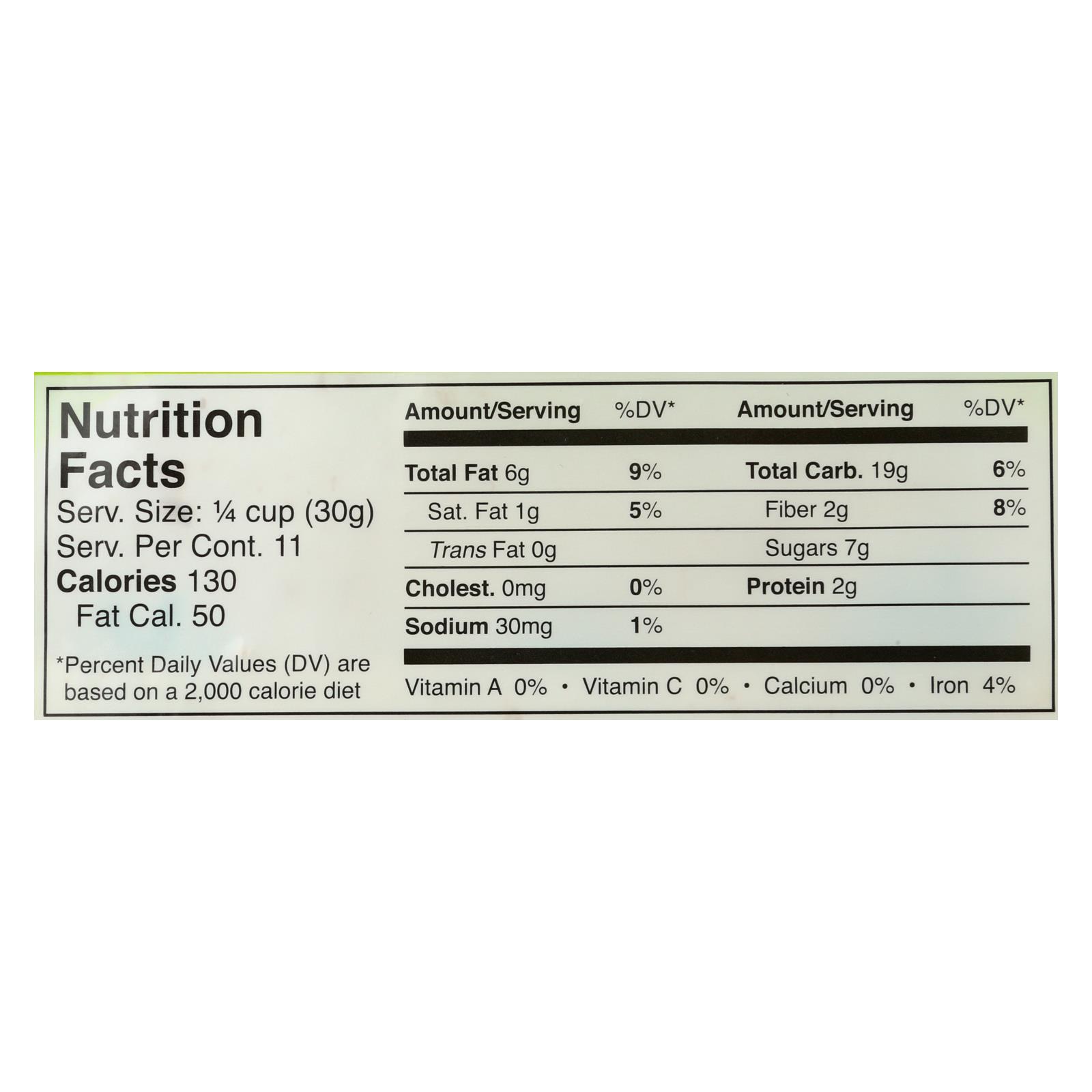 Jessica’s natural foods gluten free chocolate chip granola is baked at a low temperature, producing a satisfying crunch and flavor. Serve this granola with oatmeal for breakfast or mixed with yogurt for a lunchtime snack. The 12 oz. Bag contains 11 servings, and each serving has 130 calories for a diet-friendly treat. Made with organic honey and real maple syrup, this granola has no artificial colors or flavors.