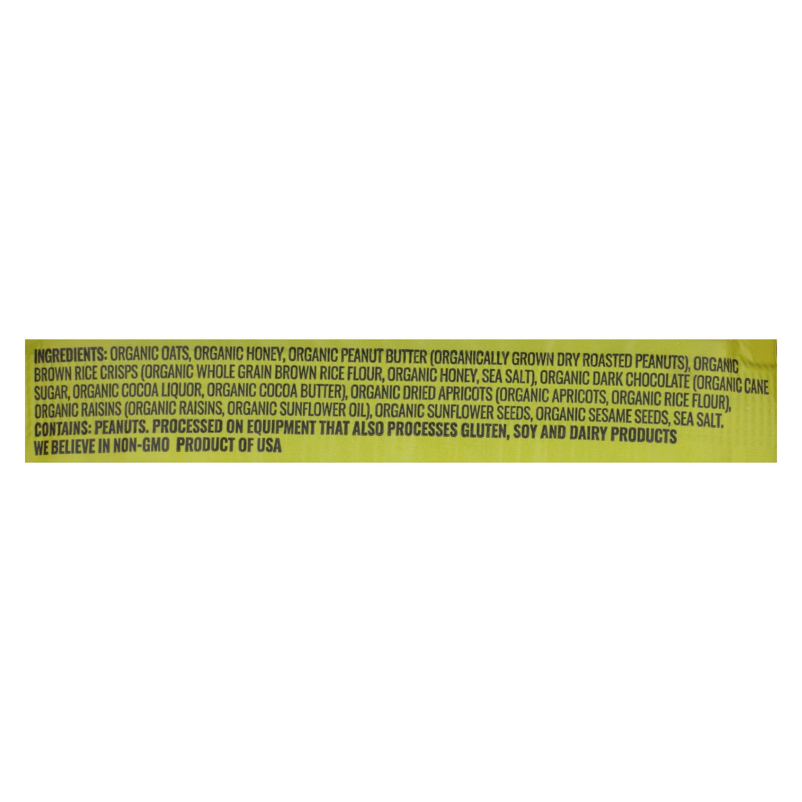 ingredients : organic oats;organic honey;organic peanut butter (organically grown dry roasted peanuts);organic brown rice crisps (organic whole grain brown rice flour, organic honey, sea salt);organic dark chocolate (organic cane sugar, organic cocoa liquor, organic cocoa butter);organic dried apricots (organic apricots, organic rice flour);organic raisins (organic raisins, organic sunflower oil);organic sunflower seeds;organic sesame seeds;sea salt