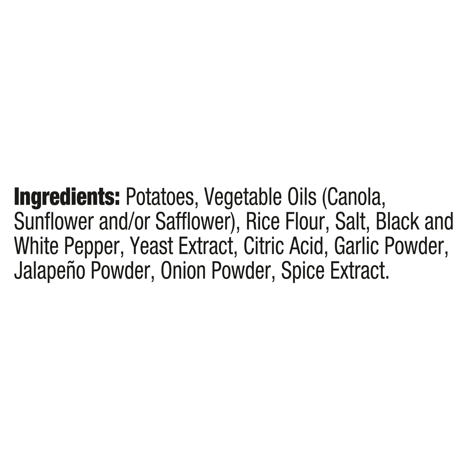 ingredients : potatoes;vegetable oils (canola, sunflower and/or safflower);rice flour;salt;black and white pepper;yeast extract;citric acid;garlic powder;jalapeno powder;onion powder;spice extract