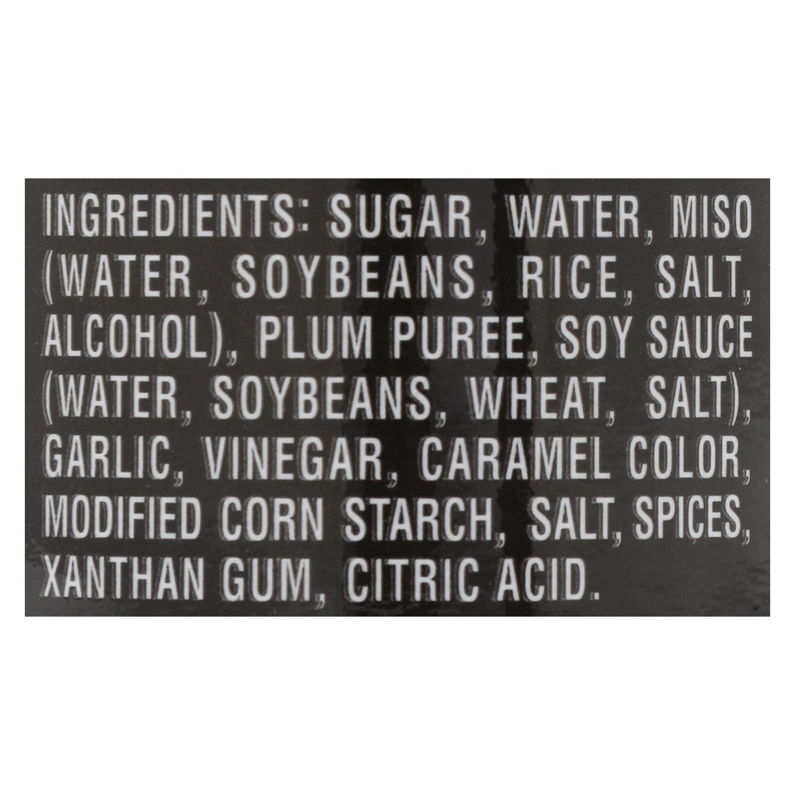 ingredients : sugar;water;miso;soybeans;rice;salt;alcohol;plum puree;soy sauce;wheat;garlic;vinegar;caramel color;modified corn starch;spices;xanthan gum;citric acid