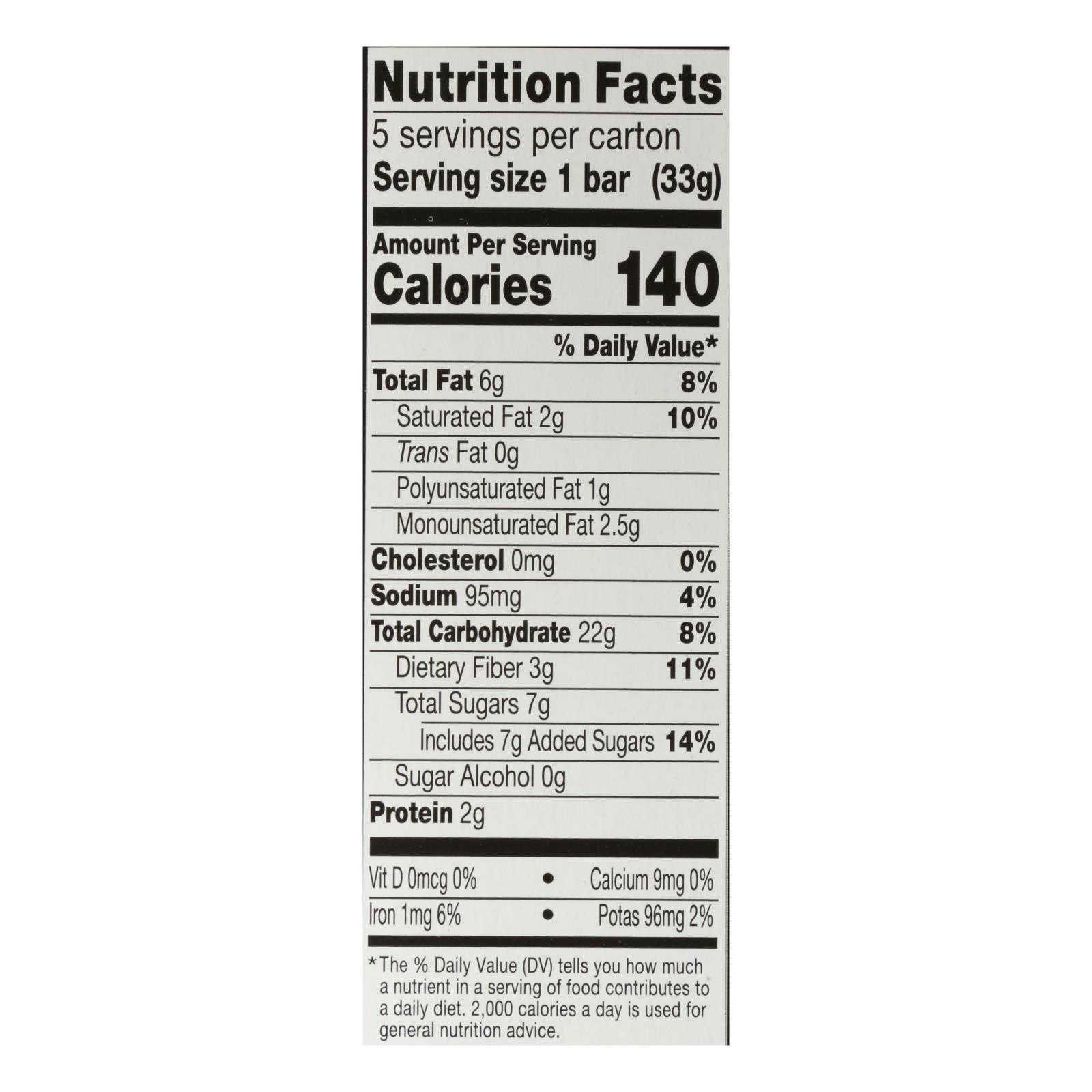 ingredients : oats;tapioca syrup;cane sugar;canola oil;peanut butter;peanuts;sea salt;brown rice;palm kernel oil;honey;chicory root fiber;brown rice flour;millet;buckwheat;amaranth;unsweetened chocolate;alkalized cocoa;quinoa;soy lecithin;natural flavor;vitamin e;tocopherols to maintain freshness;cocoa butter