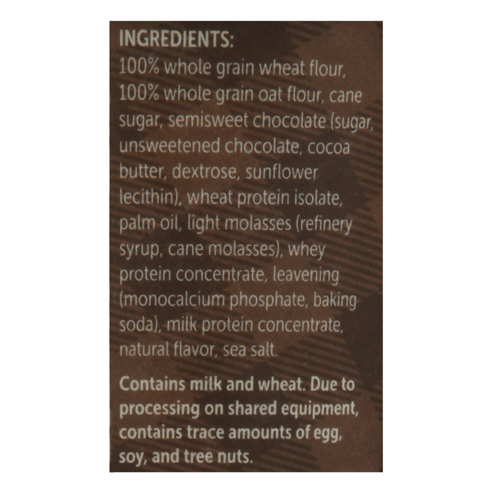 ingredients : 100% whole grain wheat flour;100% whole grain oat flour;cane sugar;semisweet chocolate;sugar;unsweetened chocolate;cocoa butter;dextrose;sunflower lecithin;wheat protein isolate;palm oil;whey protein concentrate;light molasses;refinery syrup;cane molasses;milk protein concentrate;leavening;monocalcium phosphate;baking soda;natural flavor;sea salt