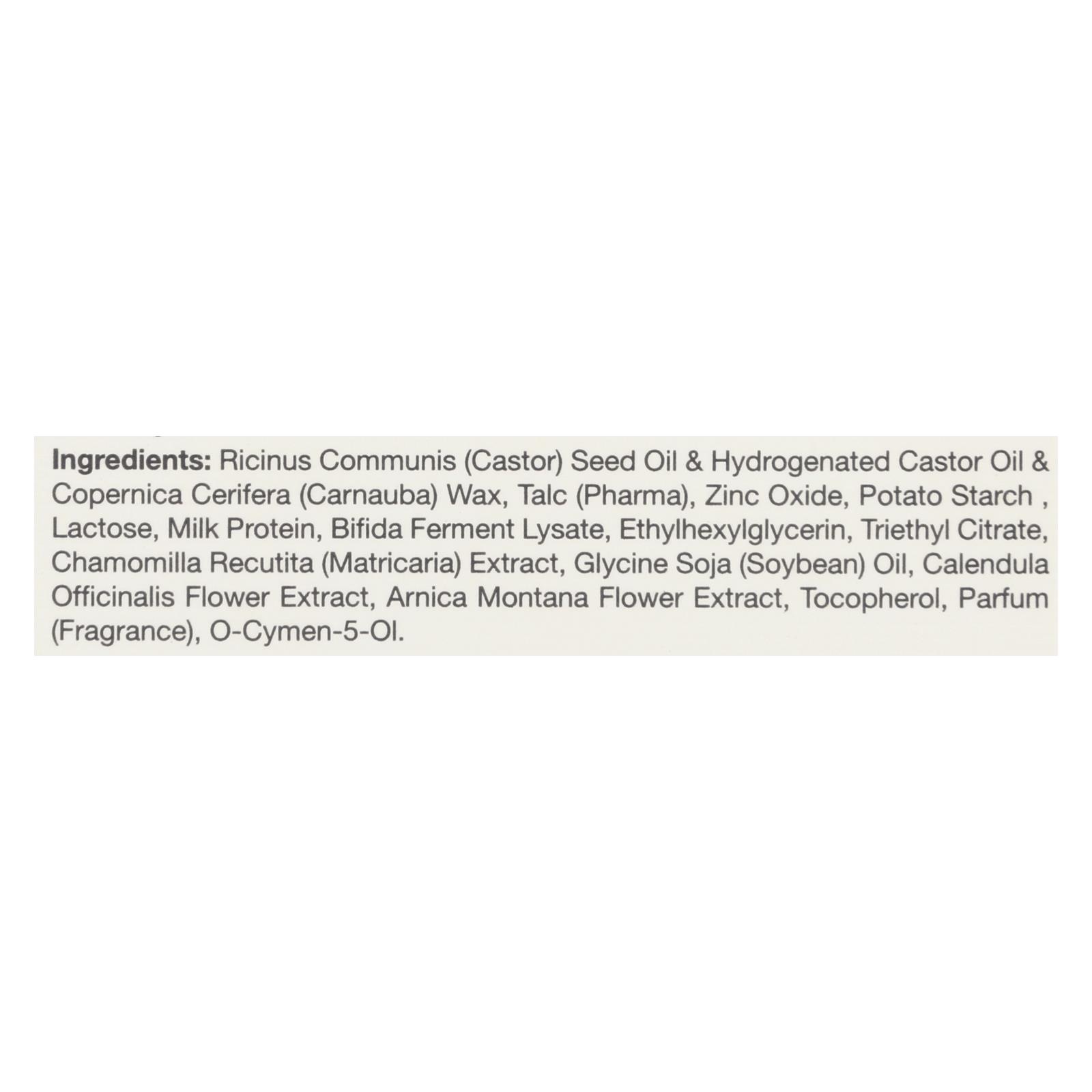 ingredients : ricinus communis;castor;seed oil & hydrogenated castor oil & copernica cerifera;carnauba;wax;talc;pharma;zinc oxide;potato starch;lactose;milk protein;bifida ferment lysate;ethylhexylglycerin;triethyl citrate;chamomilla recutita;matricaria;extract;glycine soja;soybean;oil;calendula officinalis flower extract;arnica montana flower extract;tocopherol;parfum;fragrance;o-cymen-5-oi