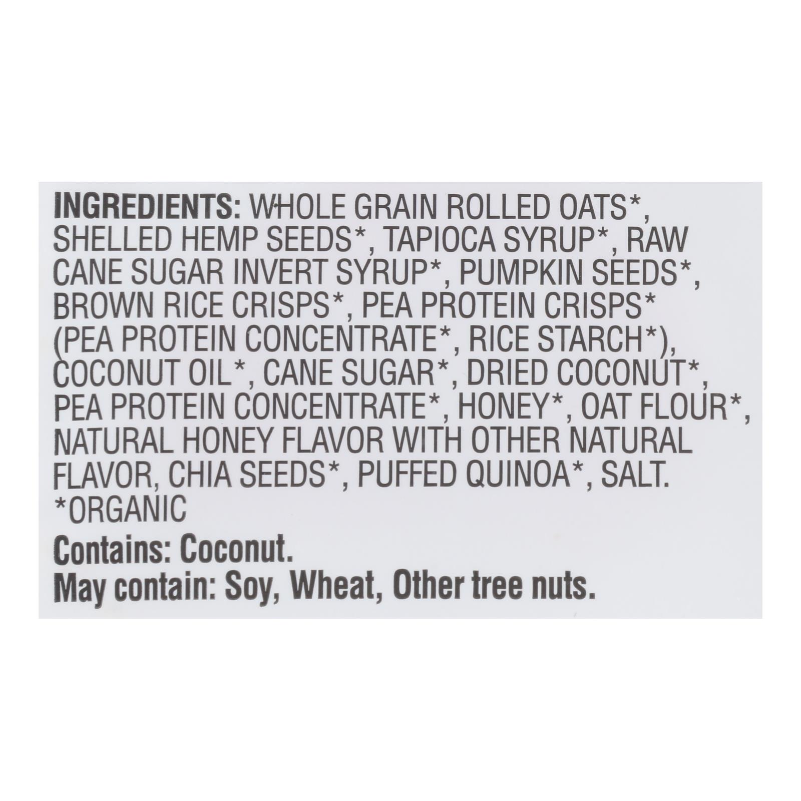 ingredients : whole grain rolled oats†;shelled hemp seeds†;tapioca syrup†;raw cane sugar invert syrup†;pumpkin seeds†;brown rice crisps†;pea protein crisps† (pea protein†, rice starch†);coconut oil†;cane sugar†;dried coconut†;pea protein†;honey†;oat flour†;natural flavor†;chia seeds†;puffed quinoa†;salt