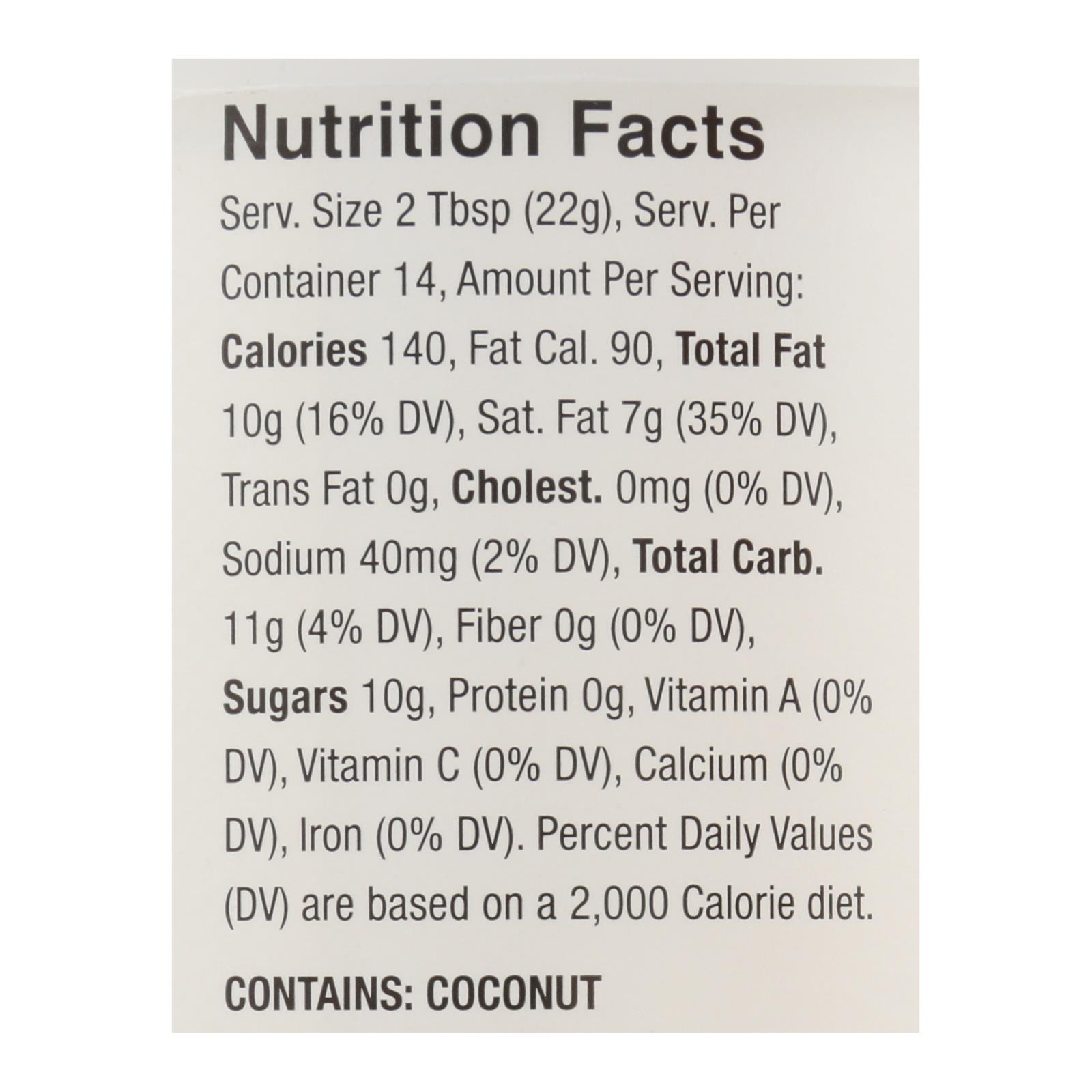 Miss jones organic vanilla frosting is certified usda organic and vegan frosting. Each 11.29 oz. Container has 9 servings of 2 tbs. Each. Our vanilla frosting has no hydrogenated oils and is trans fat free. Our frosting is made from all natural ingredients. We are proudly rainforest alliance certified.