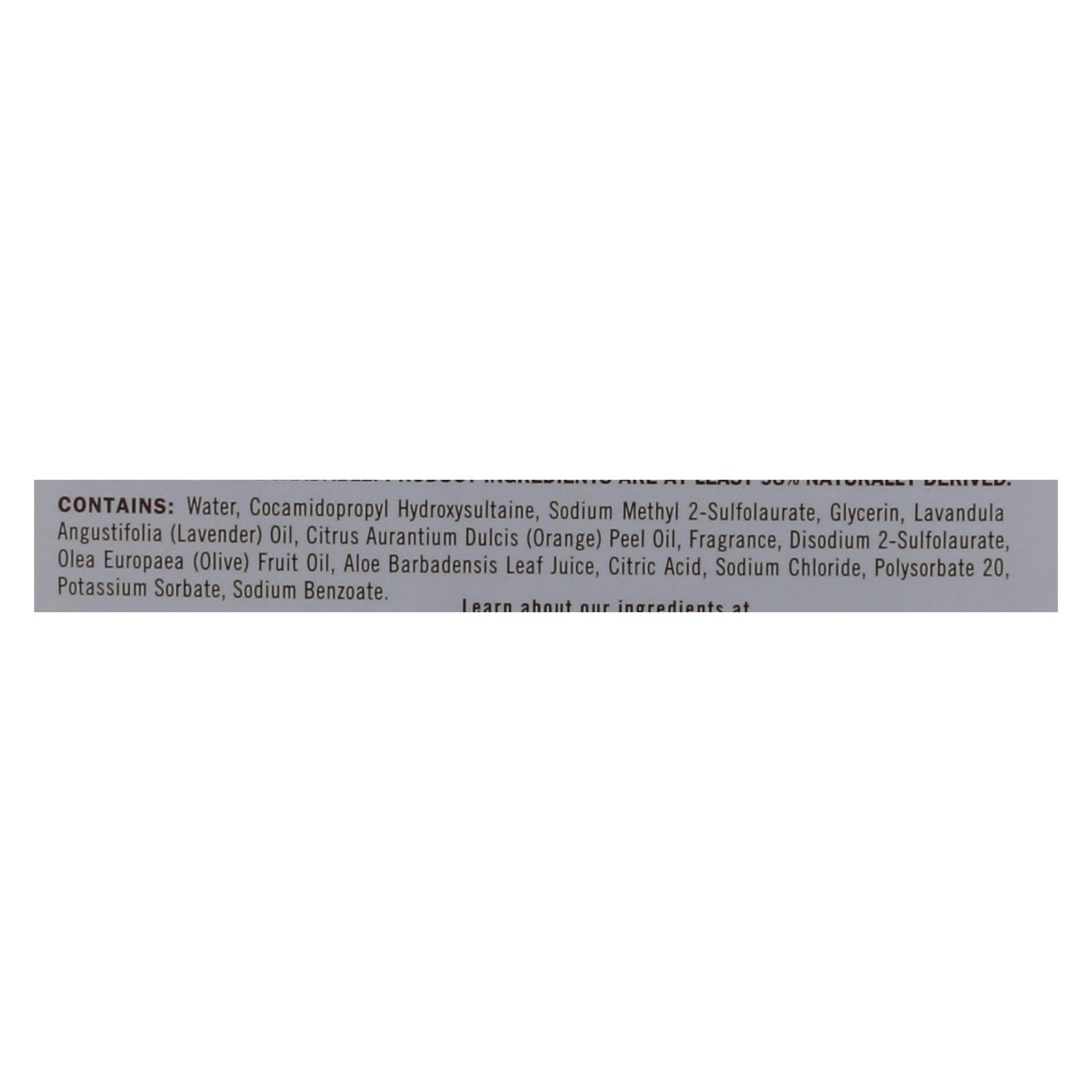 ingredients : water;cocamidopropyl hydroxysultaine;sodium methyl 2-sulfolaurate;glycerin;lavandula angustifolia;lavender;oil;citrus aurantium dulcis;orange;peel oil;fragrance;disodium 2-sulfolaurate;olea europaea;olive;fruit oil;aloe barbadensis leaf juice;citric acid;sodium chloride;polysorbate 20;potassium sorbate;sodium benzoate