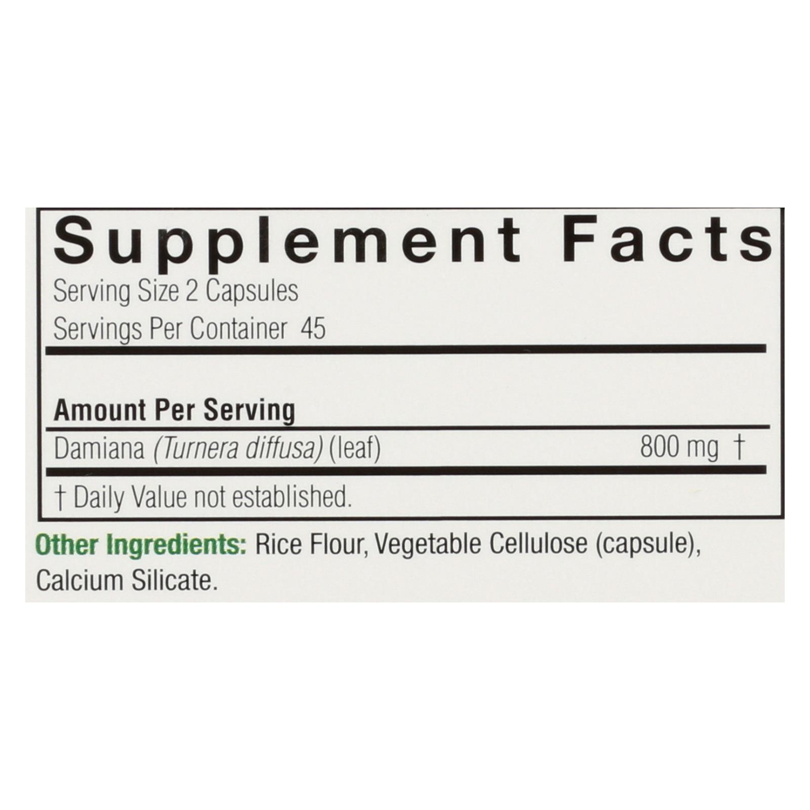Nature’s answer damiana 800 mg. Dietary supplement is a holistically balanced herbal supplement that promotes overall health and well-being. Each capsule includes the full spectrum damiana herb that’s guaranteed authentic, and the capsules are produced in a cgmp certified facility to ensure superior quality and effectiveness. This single bottle of 90 vegetarian capsules provides 45 two-capsule servings.