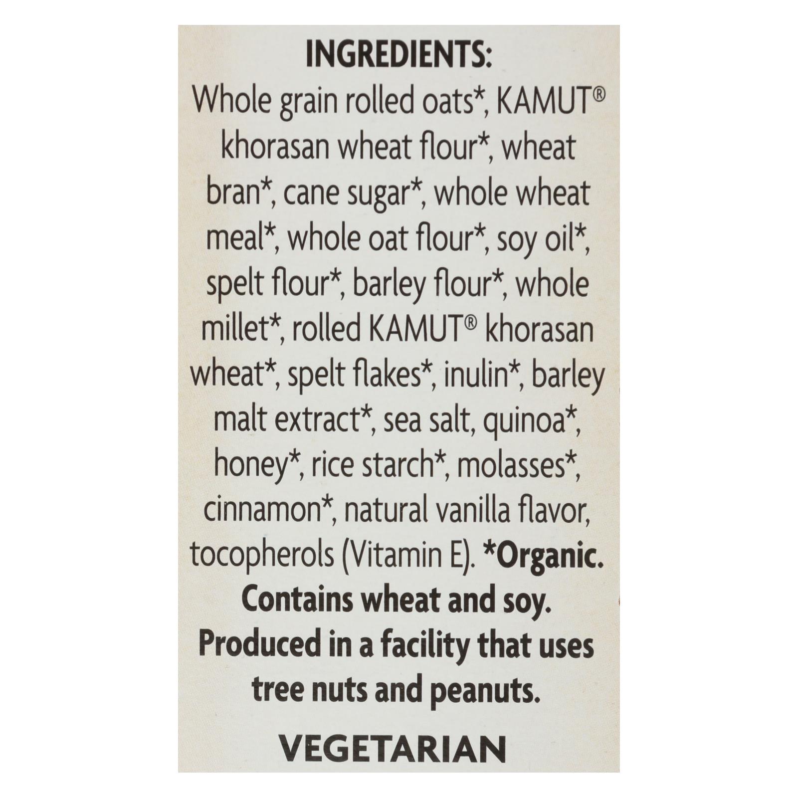 ingredients : whole grain rolled oats;kamut® khorasan wheat flour;wheat bran;cane sugar;whole wheat meal;whole oat flour;soy oil;spelt flour;barley flour;whole millet;rolled kamut® khorasan wheat;spelt flakes;inulin;barley malt extract;sea salt;quinoa;honey;rice starch;molasses;cinnamon;natural vanilla flavor;tocopherols;vitamin e