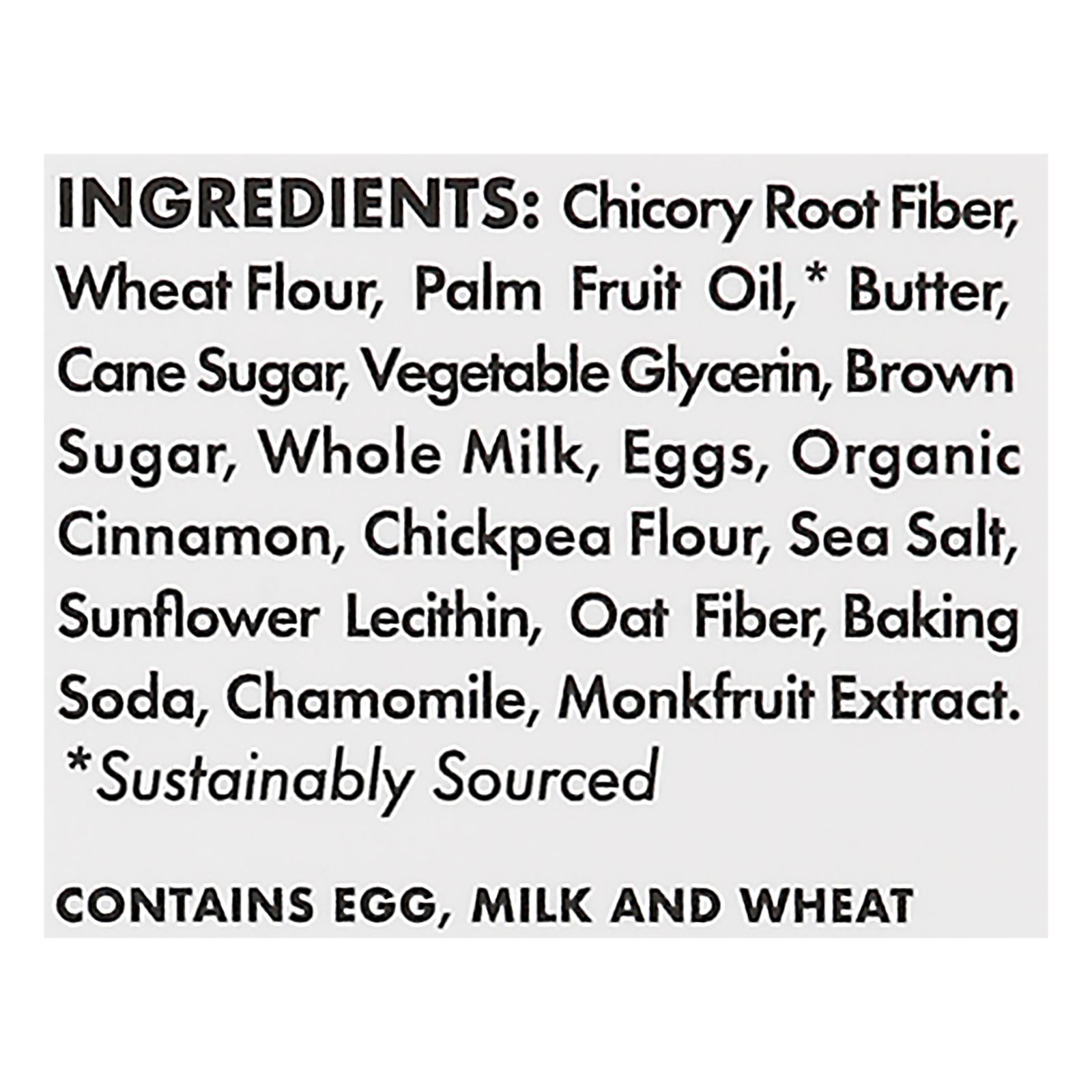 ingredients : chicory root fiber;wheat flour;palm fruit oil;butter;cane sugar;vegetable glycerin;brown sugar;whole milk;eggs;organic cinnamon;chickpea flour;sea salt;sunflower lecithin;oat fiber;baking soda;chamomile;monkfruit extract
