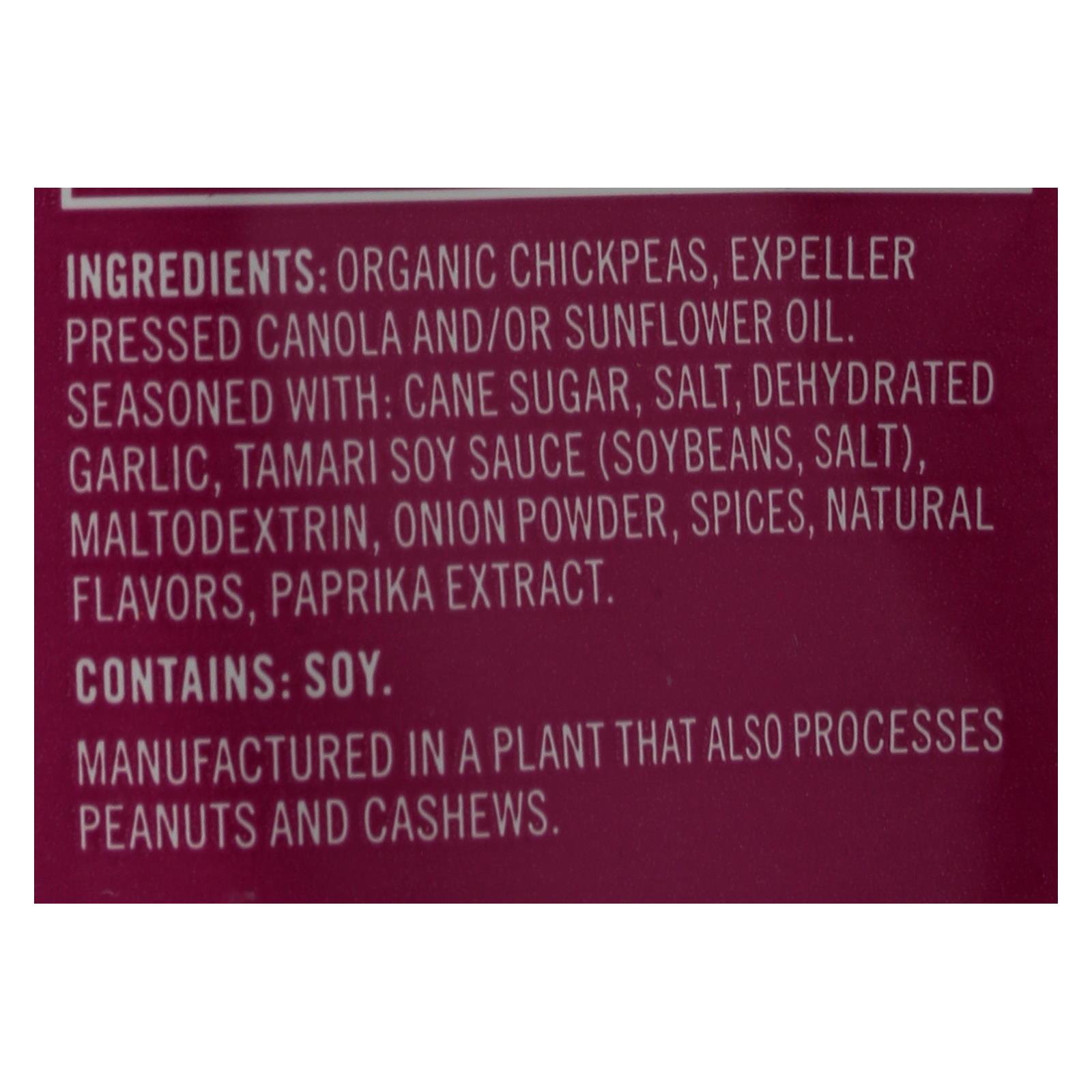 ingredients : organic chickpeas;expeller pressed canola and/or sunflower oil;seasoned with: cane sugar, salt, dehydrated garlic, tamari soy sauce (soybeans, salt), maltodextrin, onion powder, spices, natural flavors, paprika extract