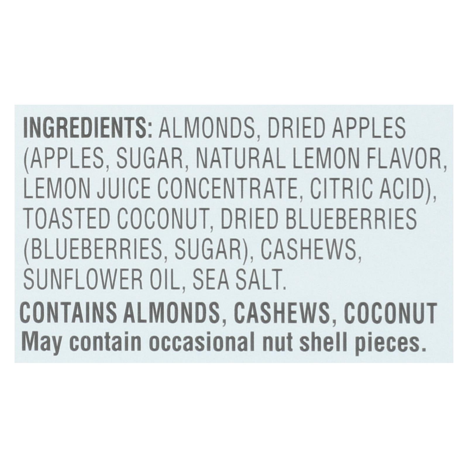 ingredients : almonds;dried apples;apples;sugar;natural lemon flavor;lemon juice concentrate;citric acid;toasted coconut;dried blueberries;blueberries;sunflower oil;cashews;sea salt