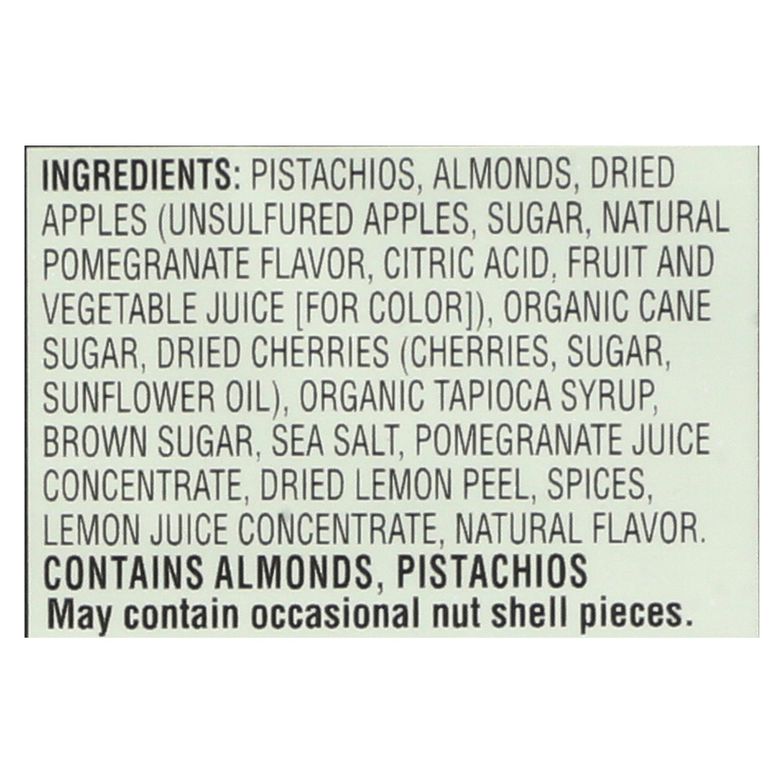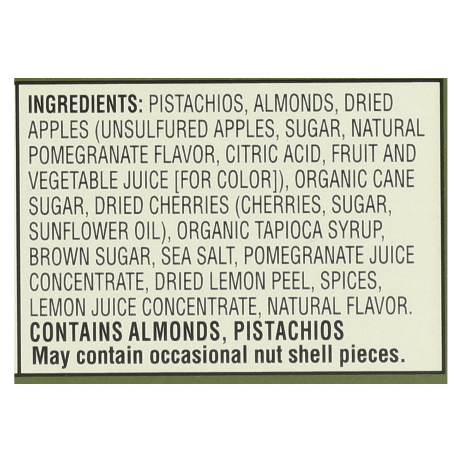 ingredients : pistachios;almonds;dried apples;unsulfured apples;sugar;natural pomegranate flavor;citric acid;fruit and vegetable juice [for color];organic cane sugar;dried cherries;cherries;sunflower oil;organic tapioca syrup;brown sugar sea salt;pomegranate juice concentrate;dried lemon peel;spices;lemon juice concentrate;natural flavor