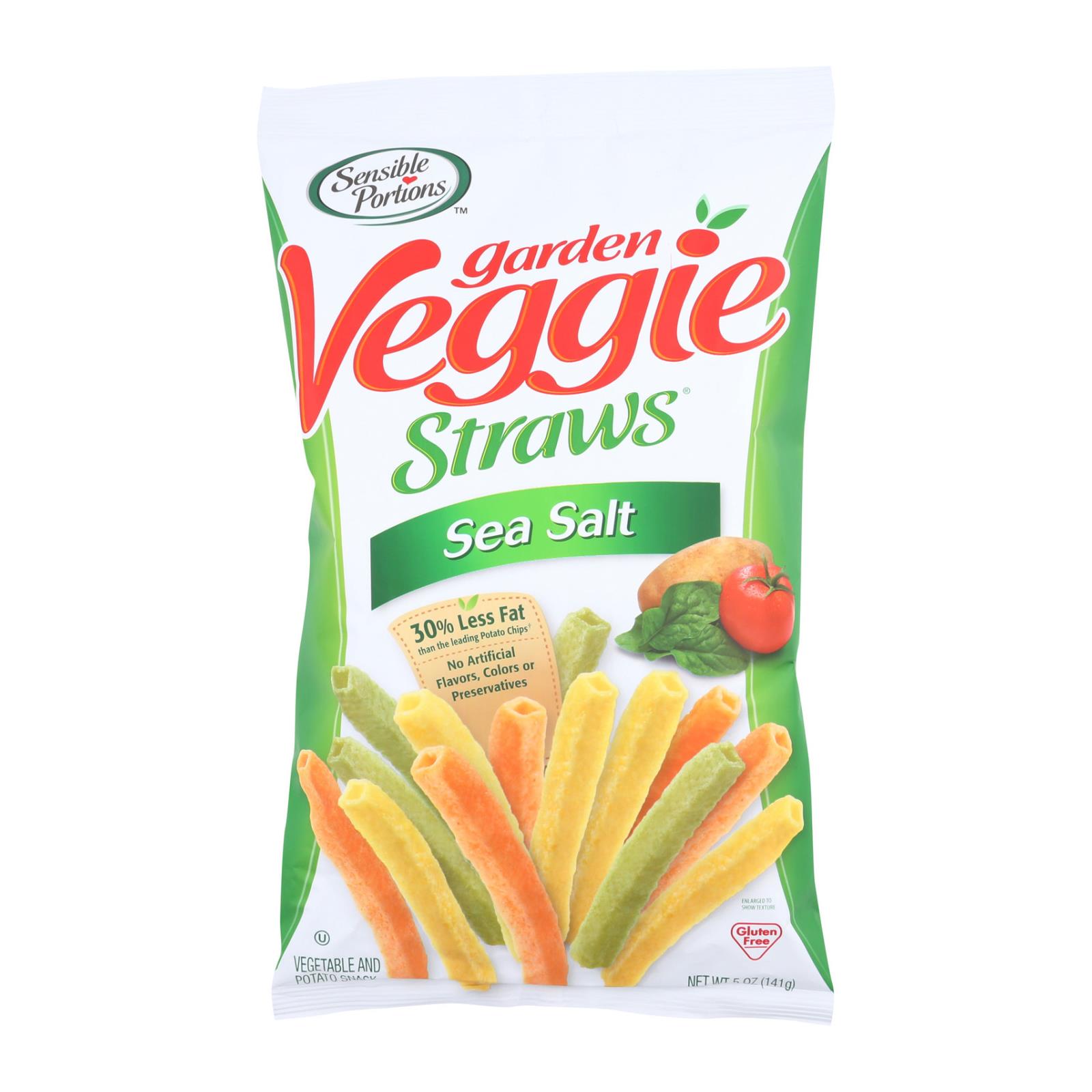 Sensible portions garden veggie straws with sea salt comes in a 5 oz. Bag and contains 30% less fat than the leading potato chips. Veggie straws are made from potato flour, tomato paste, spinach powder, turmeric, sunflower oil and other ingredients. This product has no artificial colors, flavors or preservatives.